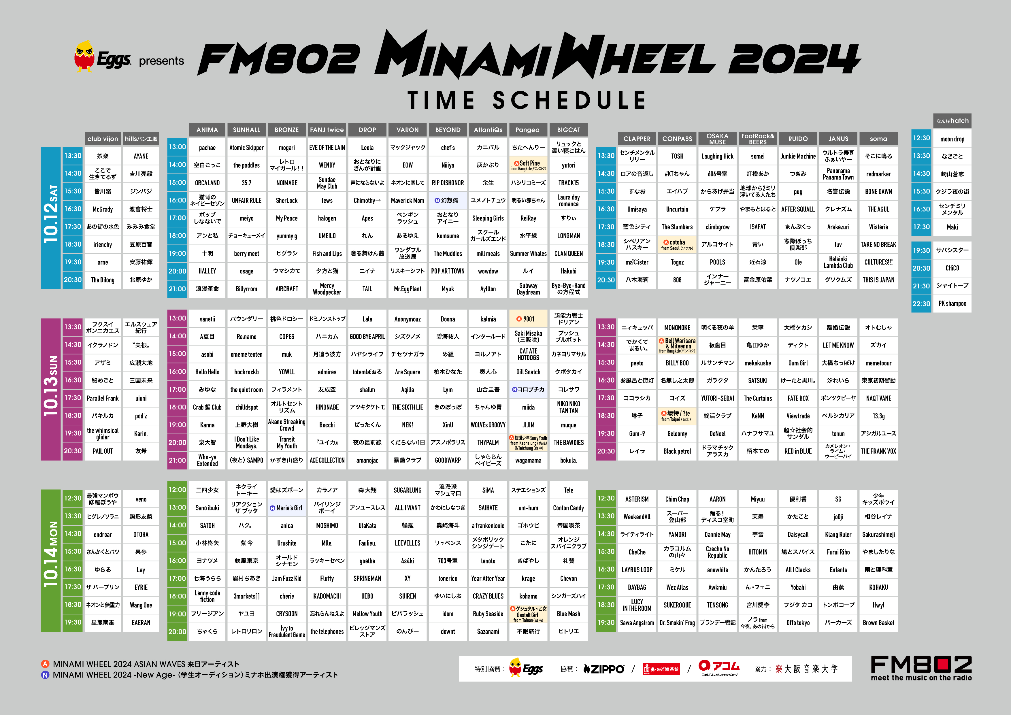 10月12日(土)~10月14日(月・祝)の3日間、大阪・ミナミエリア一帯の20会場以上のライブハウスに400組以上のアーティストが集結する『FM802 35th Anniversary “Be FUNKY!!” MINAMI WHEEL 2024』のタイムテーブルが発表された。
