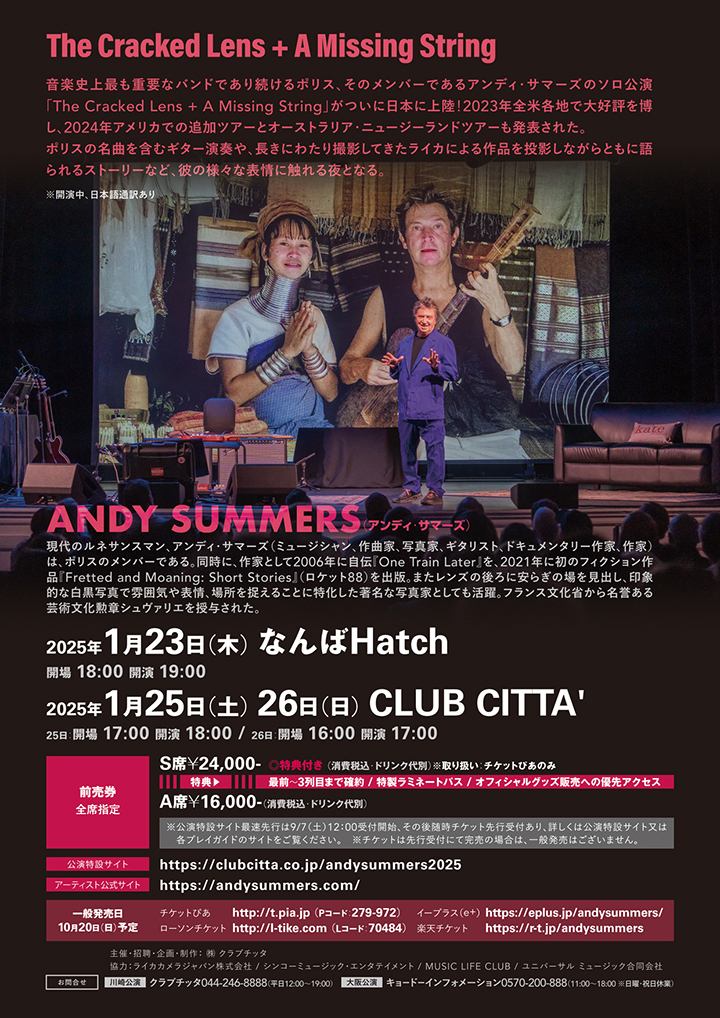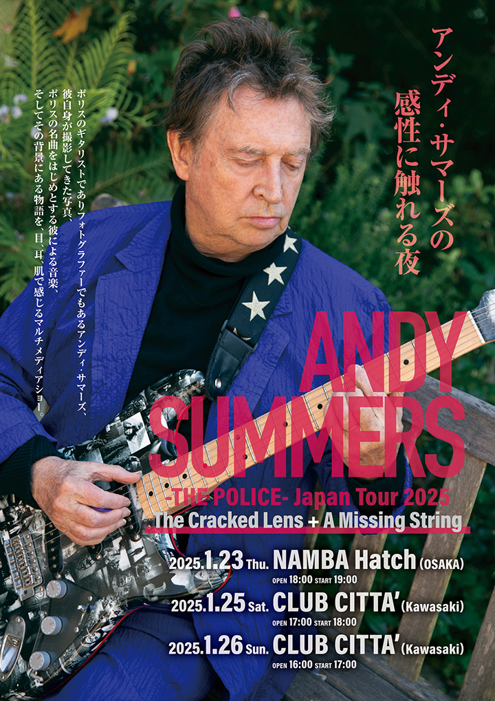 ポリスのメンバーであるアンディ・サマーズのソロ公演『The Cracked Lens + A Missing String』が日本で開催される。2023年全米各地で大好評を博し、2024年アメリカでの追加ツアーとオーストラリア・ニュージーランドツアーも発表された。