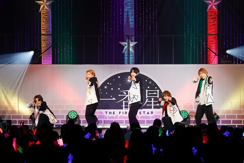 メンバー5人が登場し、客席からの大歓声の中、「THE FIRST STAR」を披露。明るくポップな曲に合わせて、笑顔で歌い踊るメンバーの姿に、会場も一気に“THE FIRST STAR”の世界に引き込まれていく。