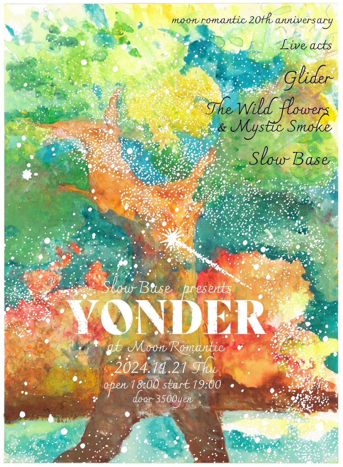 SLOW BASEにとって都内初のスリーマンイベントとなる今回の『Yonder』は、青山 月見ル君想フの20周年記念公演として実施。ゲストとして、GliderとThe Wild Flower & Mysic Smokeが出演する。