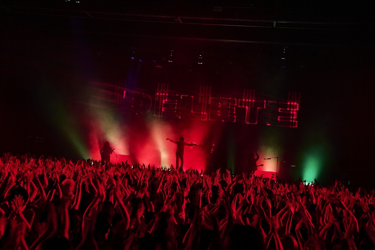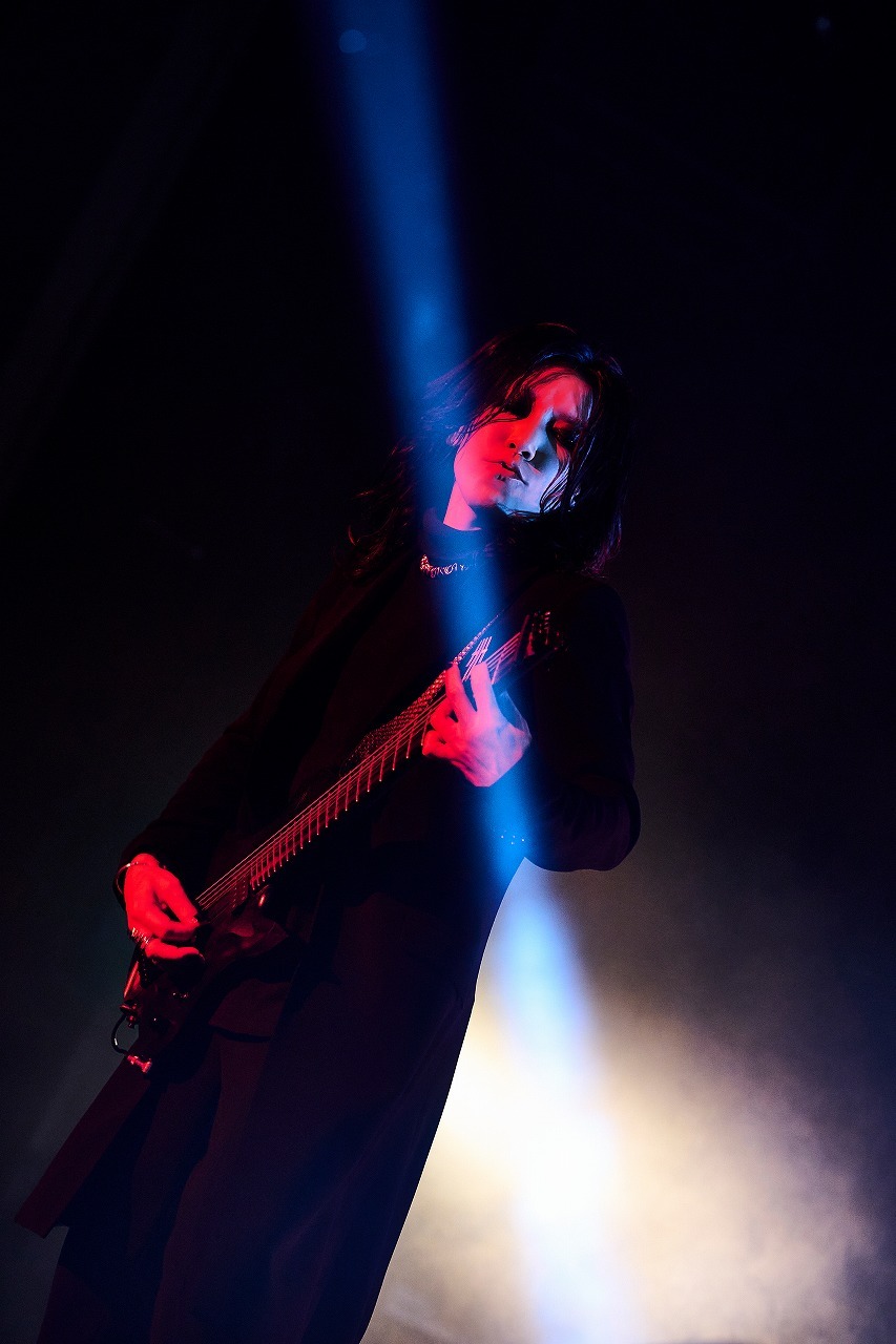 艶のあるボーカルと千切れそうなシャウトを放つRUKIが、水面を思わせる青の照明とスモークを浴び、おぼつかない足取りで孤独を綴る「DRIPPING INSANITY」からは静かなる哀しみの世界へ。すべてを吹き払うほどアタックの強いドラムに想いを感じる「QUIET」では、《今は、さよなら》と告げながらも《隣を空ける癖も》の先を歌わないRUKIに胸が詰まる。切ないギターの残響音が消え切るのを待ってから場内に拍手が湧き、太鼓のように重厚な戒のドラミングでRUKIのシルエットが影絵のように蠢いて、葵が狂おしく鳴らしていったのは「GODDESS」のイントロフレーズ。病んだ心を歌って真っ赤なライトのなかで締めくくれば、RUKIが《試しているのか?》の文言を繰り返して「BABYLON’S TABOO」の幕が開く。赤いライトが飴細工のようにホール内を走り、呪文のごとき《ADE DUE DAMBALLA》というRUKIの囁きと共に儀式めいた不穏な黒い空気を醸す、重厚でテクニカルかつトリッキーなプレイも見どころ十分だ。どんなにアグレッシブな楽曲で暴風を吹かせても、必ず挿し込まれるディープな楽曲群は、the GazettEの奥深い世界観の根幹を為すものでもある。