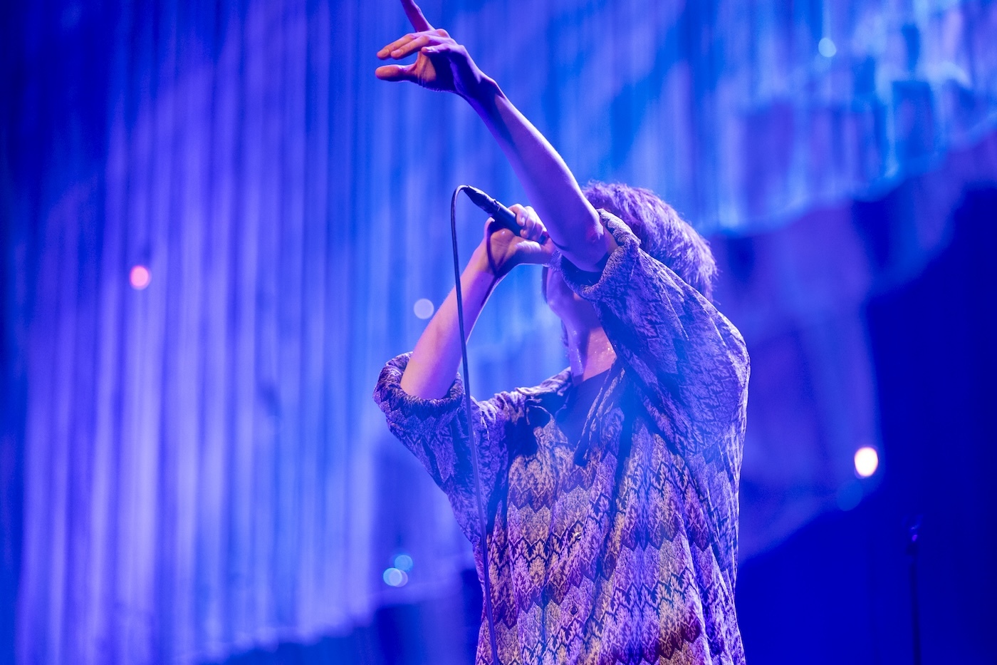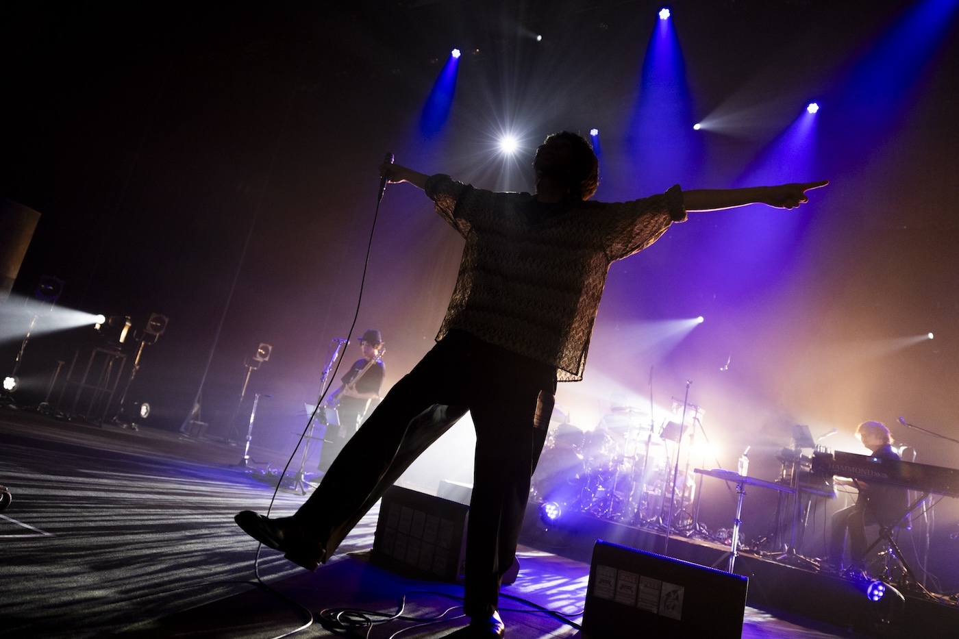 ツアーは初日からファイナルに向かって徐々に良くなっていくもの、というのは一般的な考え方だが、「その考え方が僕は苦手。それだと初日の公演は公開リハーサルなの?と」と語り、セットリストも「MIX」ツアーとは変わっていることを挙げ、バンドとして緊張感溢れる新鮮な状態でライブに挑んでいることを、ユーモラスに語っていく。「ひなたの国」を柔らかな光の下、心のこもった歌声でしっとりと届けると、ステージ背後にはオーロラのような透明な光の帳が出現。鎮魂のミディアムナンバーにふさわしい、幻想的な光景に見入った。「ヰタ・フィロソフィカ」は星空を思わせるロマンティックな光の演出の中、高らかに腕を挙げたり足を伸ばしたりと、泳ぐような大きな身のこなしで、ラブバラードを表現豊かに歌い届けた。歌詞のある部分を終えた後も、叫ぶような祈りのようなフェイクを歌い続け、厳かなムードの中で曲を締め括り、会場には大きな拍手が鳴り響いた。「真珠色の革命」も天蓋のカーテンを思わせる美しいライティングで始まり、凛として歌い出す歌詞太郎をピンスポットが照らした。ゆったりとしたビートの中で揺蕩うように穏やかに歌い始めながら、終盤には鬼気迫る爆発的なエネルギーで熱唱。歌い終えて左手を大きく回したのを合図に演奏が止まり、ギターリフが鳴り止むと、歌詞太郎は「ありがとう。」と礼をした。