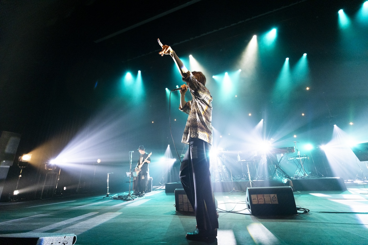 「本当に来てくれてありがとうございます、伊東歌詞太郎です!最高のライブにします! 楽しんでいってください、よろしくお願いします」と第一声は快活に挨拶。「KING」の不穏なイントロが鳴った瞬間、ファンは歓喜の悲鳴を上げた。赤や紫のダークな照明の下、ドラマティックに歌い遂げていく。「タイムマシン」のピアノイントロが鳴ると張り詰めた空気がほどけ、歌詞太郎は時折胸に手を当てて切々と歌唱。特筆すべきは、淡いピンクと黄緑の透明なライティングがまさに春の情景を想起させた「春泥棒」である。音程が乱高下する難解なメロディーを歌いこなす超絶技巧と、一音一音にぎっしりと詰まっている細やかな情感にただただ圧倒された。