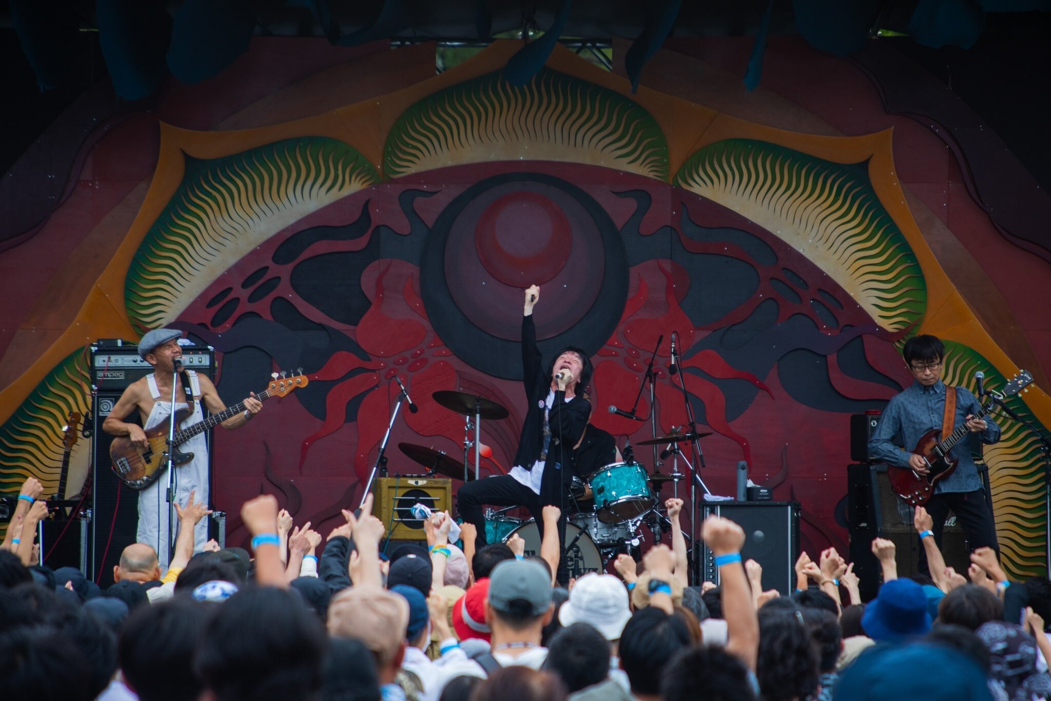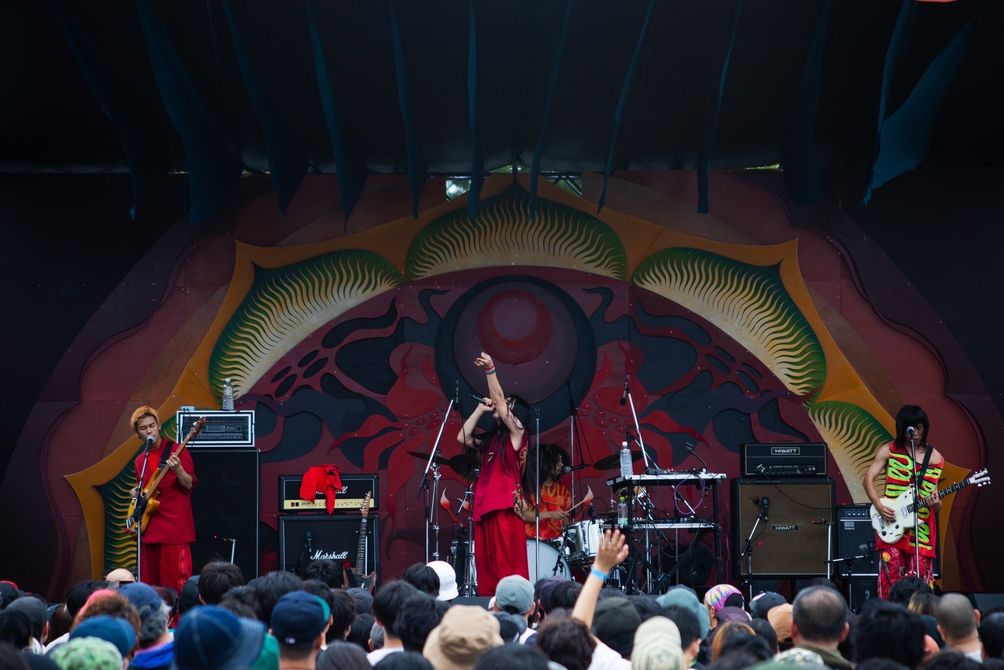 そして主催者の大原氏が「めちゃくちゃ楽しみなライブの1つです!」と話していたのはGEZANだ。ステージに現れると、目に飛び込んでくる赤い姿。「blue hour」で今日のステージを始めていく。マヒトゥ・ザ・ピーポー(Vo.Gt)の特徴的な高音が、有料エリアの外にも届いたのだろう。1曲目が始まった途端、たくさんの人がエリア内に傾れ込んできて注目度の高さが伺える。バンドが奏でるサイケデリックな音の気持ちよさに観客の体がユラユラ揺れたかと思えば、マヒトのシャウトに誰もが黙って聴いた後、歓声が上がる。見ているこちらの情緒が安定しない。同じように思っていただろうか、隣の男性が「Soul Material」を一緒に歌い続ける。新しい曲やりますと披露された楽曲はフロントにるマヒト、イーグル・タカ(Gt)、ヤクモア(Ba)の3人が一斉に歌い出しえげつないインパクトをぶん投げてくる。この曲の後半、バンドの音がうねってエモーショナルな展開を見せていく最中で会場には再びの雨。慌ててレインコートを羽織る人、雨を避けられる場所に走る人……は少数で、雨などもろともせず音に身を委ねる人の多さにGEZANの中毒性を感じずにはいられない。ラストにマヒトが「どうもありがとう。続いていくことを祈って最後やります。ありがとうございました。風が気持ちいいね」と放ち届けられた「DNA」まで、GEZANがGEZANたる所以を見せつけられたような濃密な40分。特にラストソングではバンドの音が切れても響き続けたマヒトのシャウトに、観客エリアのいろんなところから「ヤバい」「ヤバかった」という言葉が呪文のように飛んできたことに、うなずくしかない彼らのライブだった。