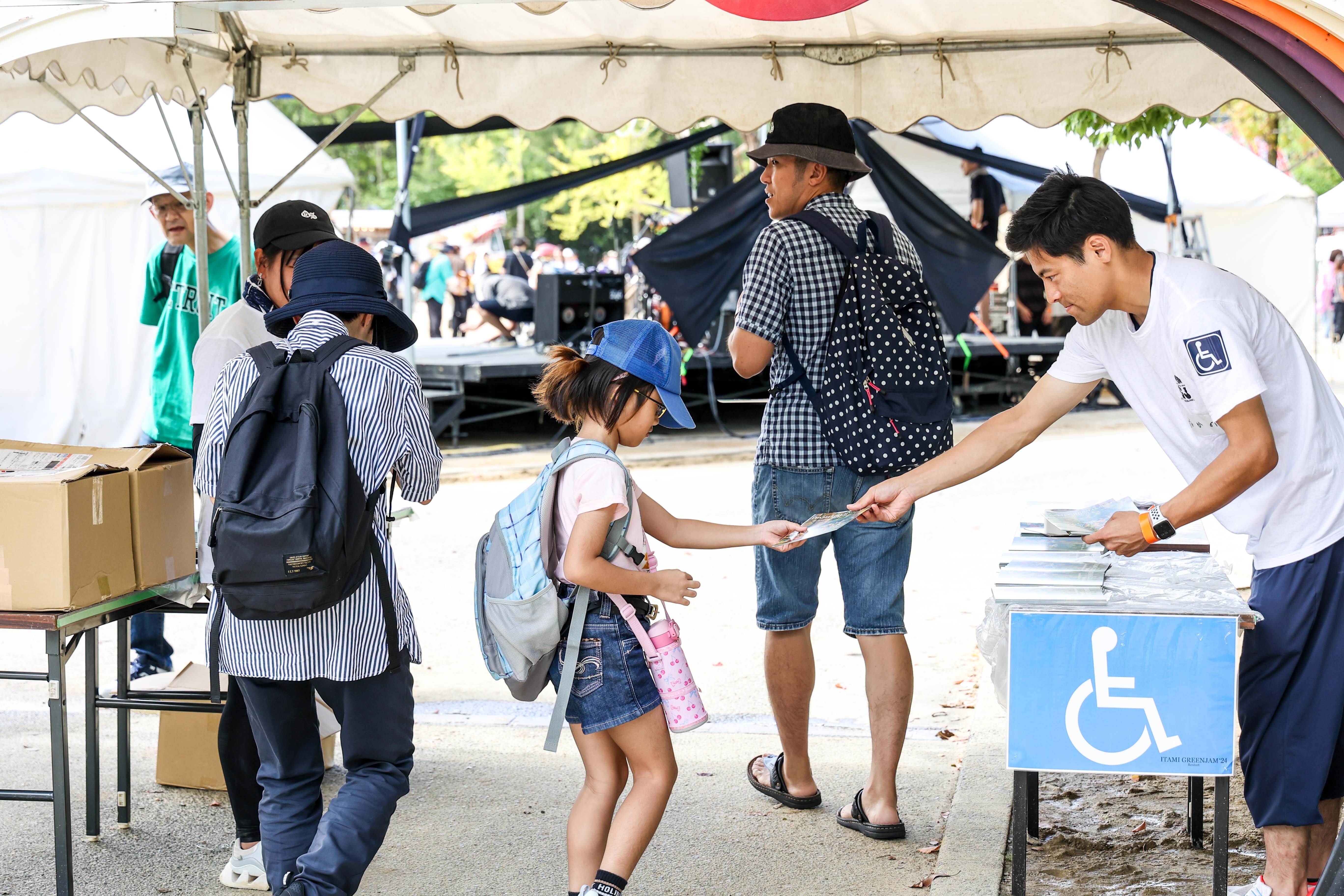 ライブを行うエリアに関して、これまでステージ前方に一部有料エリアを設けるものの基本的には無料でライブを観覧することができた。しかしイベントの集客数が伸びたことによる会場内での安全性の確保を理由にしたライブエリアの区画化と、この先も『ITAMI GREENJAM』を継続するためには来場者からの資金サポートも必要との判断がなされたというのが有料化へと踏み切った背景だ。そこで今年取り入れられたのが、イベント自体は入場無料、ただし「LIVEステージ前エリアのみサポーターパス制(中学生以下は無料)」というもの。これが一般的なフェスのライブ鑑賞チケットにあたり、メインステージのライブが見られるのはこのエリア内に限定されたことがひとつ、そしてチケット代は1000円、3000円、5000円と金額に幅が存在するものの内容は全て同じで、当日会場では特別スポンサーである大阪西成のブルワリーDerailleur Brew Works(ディレイラ ブリュー ワークス)によるイベント限定のオリジナルビールがリターンとして配られる。チケットの販売サイトには「各種に内容の違いはございません。お気持ち次第でお選びください。頂きましたサポート金はありがたくイベント運営費に活用させて頂きます。」との言葉が添えられていた。このチケットは早々に完売。両日共に、たくさんのサポーターがエリアを埋めた。