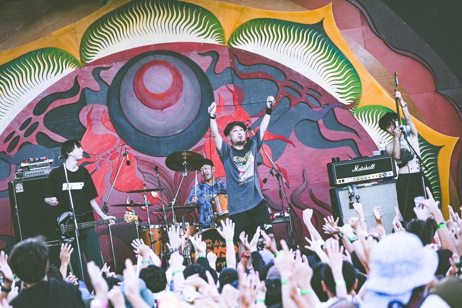 そして2日目のライブはGOING UNDER GROUNDから。「トップバッターよろしくお願いします」と「グラフィティー」でライブを始めていく。青空、いい風、広がっていく松本素生(Vo.Gt)の澄み渡る歌声とグッドメロディー。上空には飛行機が飛んでいく。たった1曲で、彼らが観客の心を掴んだのが確かにわかる。「20数年やってると1曲やると今日が最高かどうかわかるんだよ。今日、最高!」という松本の声を合図に演奏された「昼呑み」は気持ちよさを増幅させ、午前中だけどビール飲んじゃおうぜ〜! と気持ちが大きくなる。『ITAMI GREENJAM』初出演である彼らは「自信のある曲だけ持ってきました!」と言い、事実、突き抜けたロックナンバー、エモーショナルな歌詞とメロディーが際立つ曲、コミカルな表現に思わずニヤリとさせられる曲……と、披露できる曲数には限りがある中でも彼らの多面性をどんどん見せてくれる。中でもそこにいた全ての人の体温を上げていたのは、最初の1フレーズだけで歓声が上がった「トワイライト」。サビの大合唱は今年のライブのハイライトになる、そう思えた光景だ。そしてラストソングは彼らのライブアンセム「LISTEN TO THE STEREO!!」。歌詞も適当でいいから、音楽好きなやつは歌ってくれ! その声に応えるように、そこら中から歌声が聞こえる。ラストには松本の「一緒にライブができたこと、嬉しいよ。また会えるその時までどうかお元気で。この時間は全員がGOING UNDER GROUNDでした。また一緒にバンドやろうぜ!」という言葉が飛び、この日の天気、観客、セットリスト、ライブの展開、心地よく吹き抜ける風も、何もかもが彼らに味方していたような40分だった。
