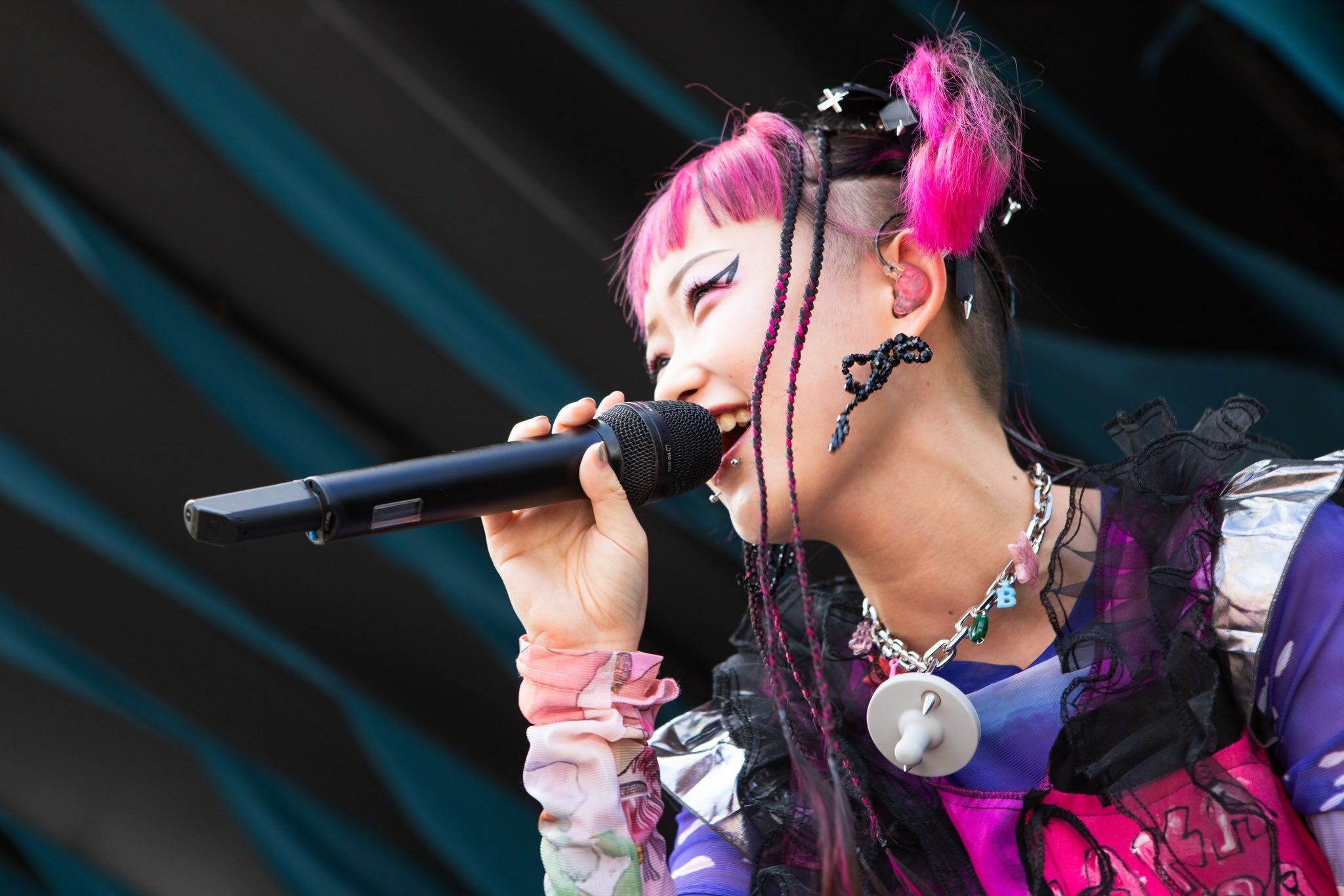 この2日間、ここまで子どもたちの姿をライブエリアで見ただろうかと思うほど子どもの姿が目立った正午過ぎ。ライブスタートは12時半、まだまだ子どもたちが入場口から入ってくる。開始2分前、待ちきれず始まった手拍子を圧倒されながら体に受けていると歌声が聞こえてきた。水曜日のカンパネラの登場だ。……しかし歌声は聞こえるのに、詩羽の姿が見えない。どこから登場するのか、誰もがキョロキョロと探している。人が多すぎて彼女がどこから登場したのか目視で確認できぬまま、「やほー! やほー!」とステージから手を振る詩羽が目に飛び込んでくる。子どもたちの歓声が、飛び交うライブエリア。「詩羽でーす! 暑い! 元気に声出したり、手を上げることできますか?」というと、子どものはーい! という声と大人たちの手がググッと上がる。コール&レスポンスやってみようと練習をすると……「チビちゃんの方が大きい声聞こえるよ! 大人―! 甘ったれるなー!」とケラケラと楽しそうだ。人気曲の「ディアブロ」に続き、「たまものまえ」ではキッズダンサーも交えて曲を披露。なんと彼ら、地元伊丹のJACK POT DANCE FACTORYのダンサーたちだそうで、一線級のアーティストとスペシャルコラボレーションできるのもなんて夢のある話……! そして「桃太郎」を歌う際には、ついにクリアな巨大バルーンに入り込みバルーンごと客席へダイブ。フロアにはあまりに子どもたちが多く「危ないよー!」と時折言っていたのも、ちょっといいエピソード。その後もリズムに合わせてタオルを振り回す「マーメイド」や超人気の「エジソン」など、披露されたのはかなり多めの全9曲。子どもと大人が一緒に楽しめる、希少なステージを見せてくれた水曜日のカンパネラだった。