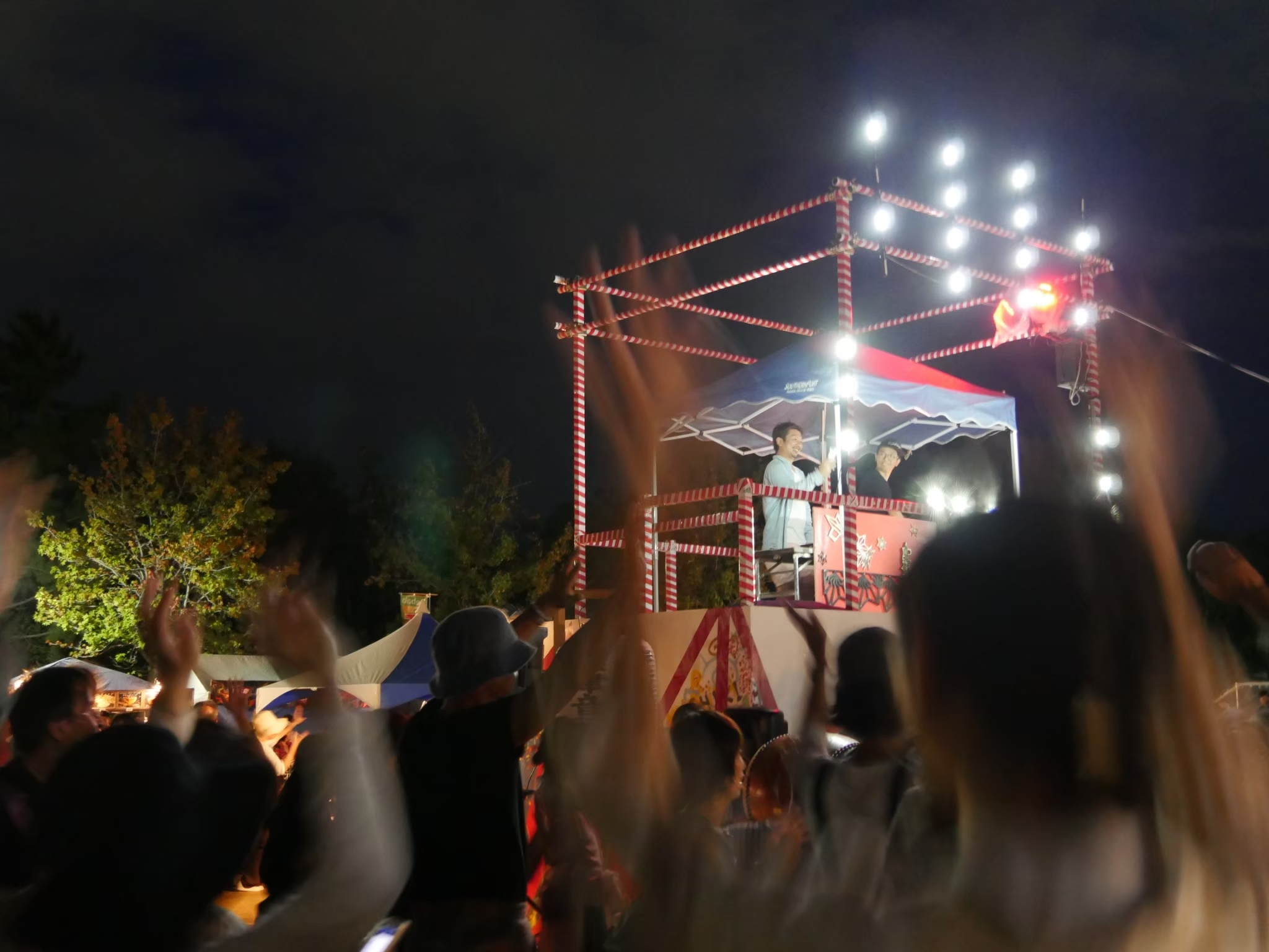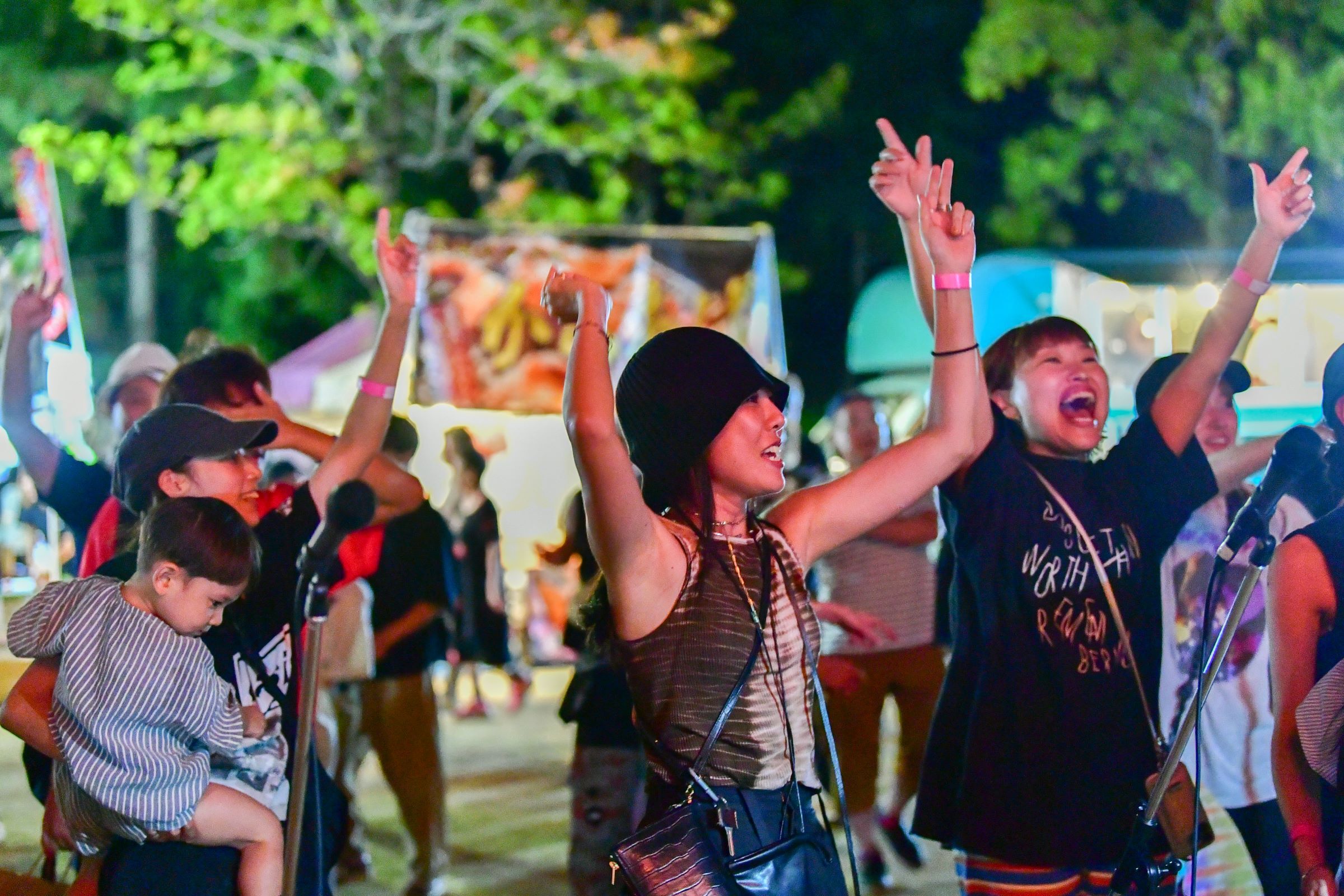 盆踊りを楽しむ面々はライブエリアにいた音楽好きたちとはまた異なる印象で、この盆踊りをめがけて楽しみにきた近所の住民たち、純粋に盆踊りとフードエリアを目指してきた人が多いように感じる。それもまたこのフェスがいち市民祭りであると感じさせてくれた理由のひとつだ。伊丹を中心に爆発的に盆踊りで踊られているという「ビューティフル・サンデー」が流れ出すと、四方八方から人が輪に加わり踊り始め、まさに踊る阿呆に見る阿呆、同じ阿呆なら……というやつで、とにかく賑やかに初日の夜はふけていった。