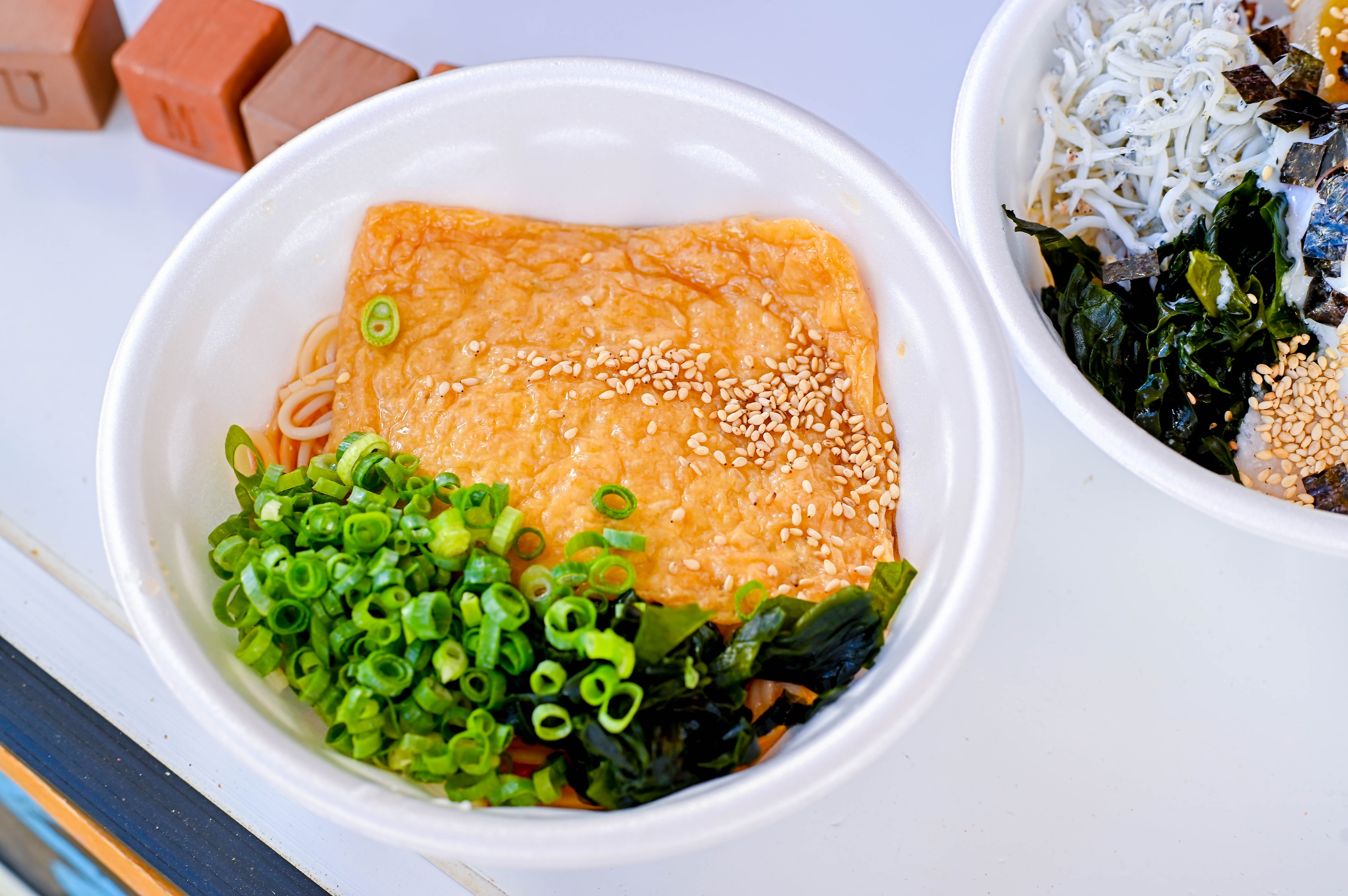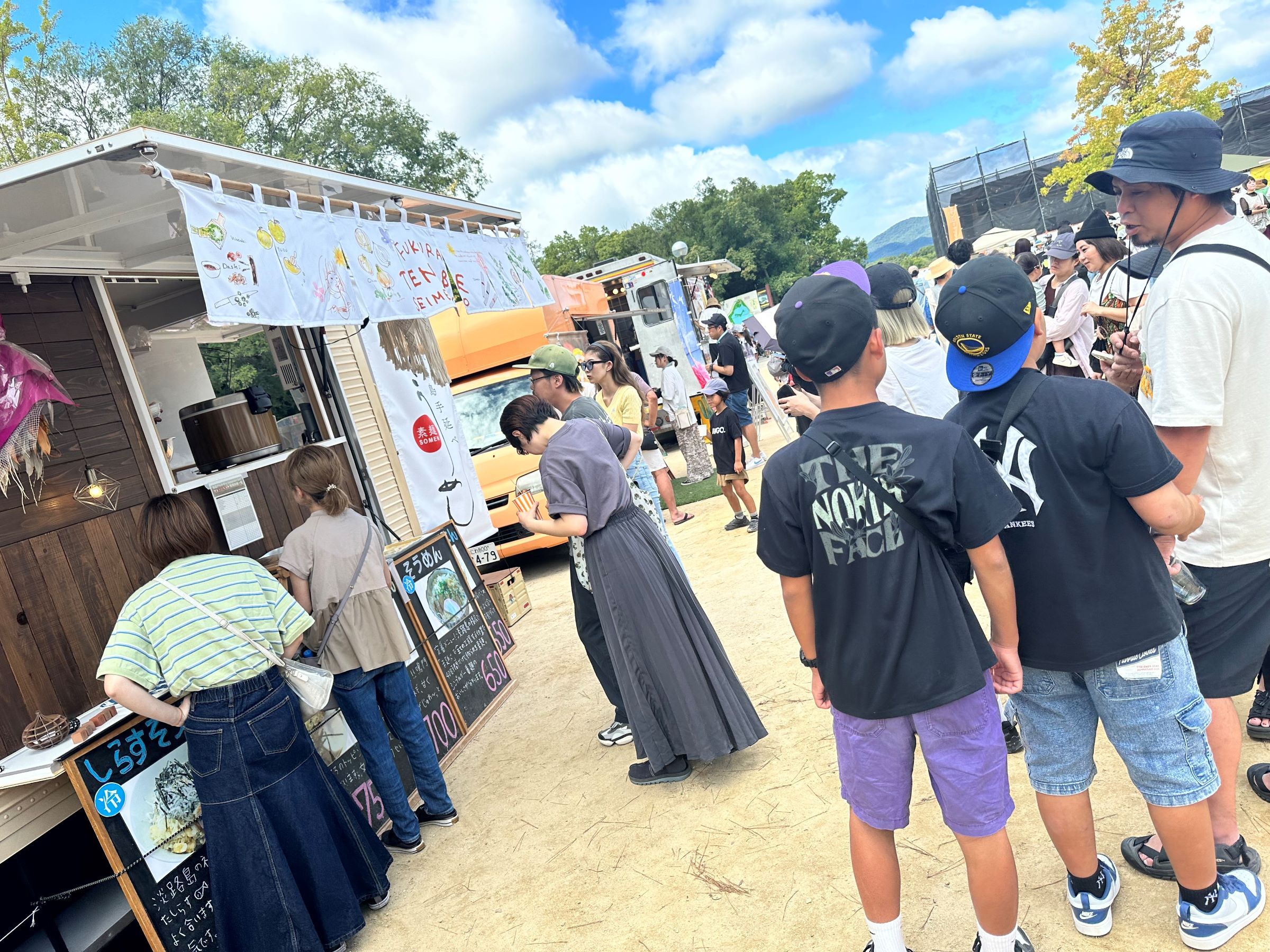 そして低年齢の子どもとフェスに行って困るのが、食事だ。まだ食べられないものも多い年齢の子どもと行く場合、昼食を済ませてからの方がラクだな、なんならフェスに行くことすら諦めてもいいほど……。しかし、この日見つけた「手延べそうめん」のフードトラックに歓喜! うどんやそうめんは年齢問わず子どもが食べてくれるメニューの筆頭株、うちと似たような年齢の子どもを持つファミリーで長蛇の列ができていた。一般的なそうめんより少し太めのそうめんは食べ応えもあり、添えられた甘めに炊かれたおあげが娘にヒット。おかげで近くのうどん屋を探して駆け込む必要もなく、会場にとどまり続けることに成功した。
