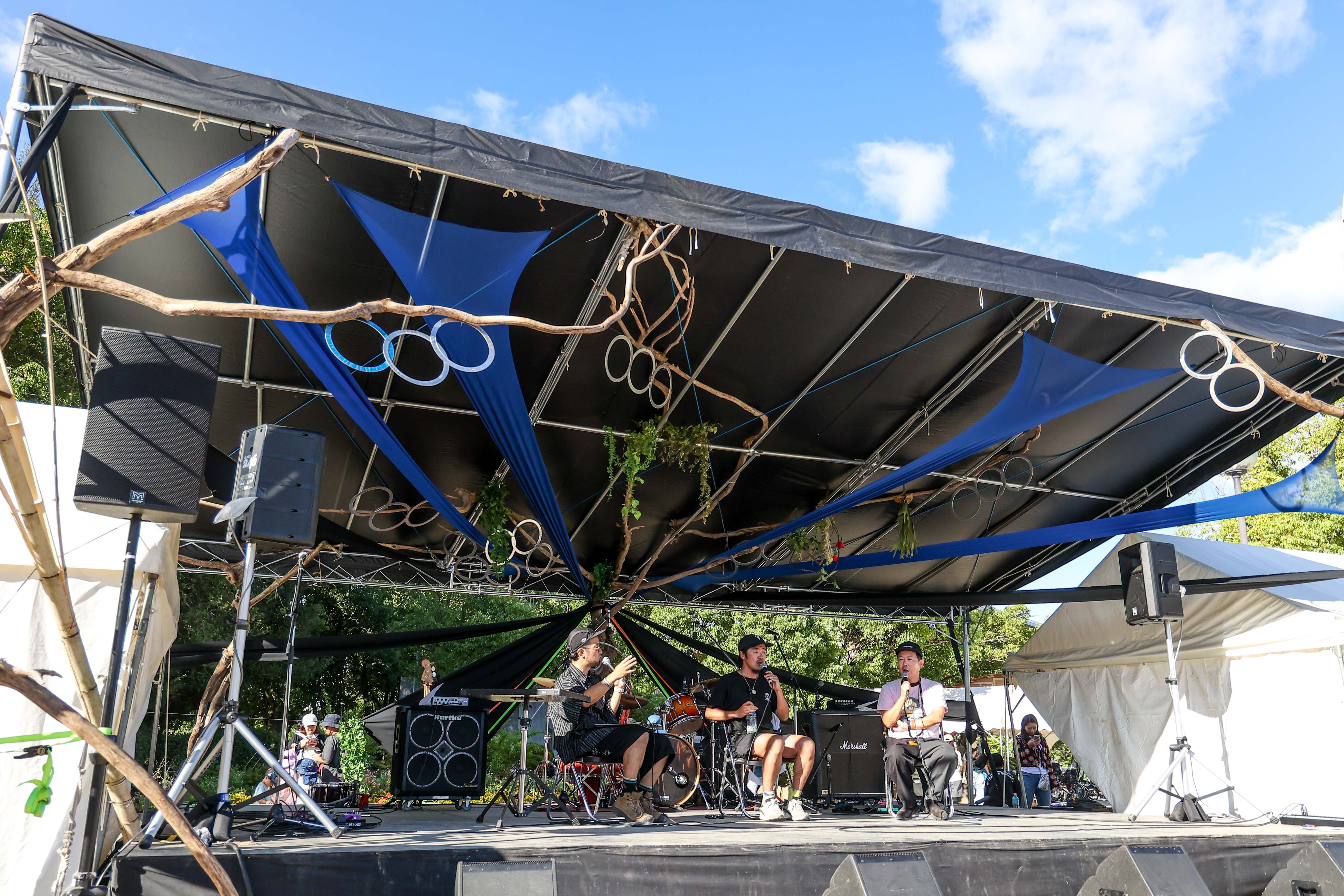 会場である昆陽池公園は最寄りの阪急伊丹駅からバスで約10分、都市部では珍しい渡り鳥の飛来地として知られており、大きな溜池を要する緑豊かな市民のオアシスだ。近くに伊丹空港もあり、かなり頻繁に旅客機が飛んでいく景色もここならではだ。その公園内に2つのメインステージを擁するライブエリア&フリーピクニックエリア、キッズエリア、マーケットエリア、フードエリアなどが公園のさまざまなスペースを使って展開される。ものすごくギュっと凝縮した小さなフジロックのよう、と言うとなんとなくイメージを掴んでもらえるのではないかと思う。