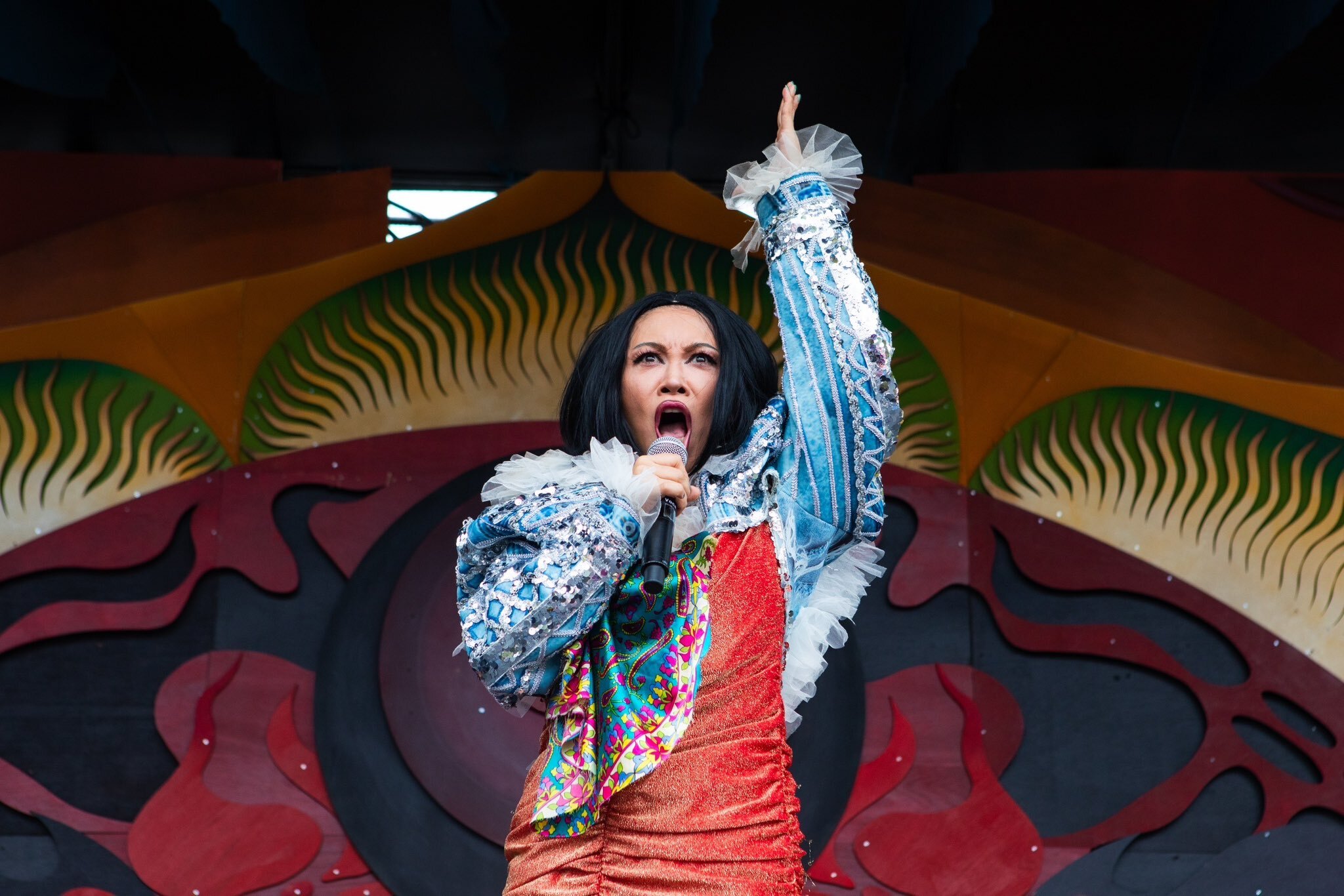どんどん強くなる雨足に、客足も途絶えるか……とさえ思った正午。そんな心配をよそに、エリア入り口は長蛇の列、エリア内は人でパンパンになるほど注目されていたのはミラクルひかる。本人がステージに姿を現さぬまま、研ナオコの声だけでいくつもボケ倒していく様に、会場内がザワァ。ついに登場! と姿を見せた時には大きな歓声と拍手、なぜなら広瀬香美で登場したからだ。この日のライブの詳しい内容をレポートしたいが、文字にすると野暮な気もするので、誰のネタを披露したか記しておきたい。JUJU、工藤静香、高橋真梨子、浅野温子、松任谷由実に竹内まりや、椎名林檎に八神純子、篠原涼子に渡辺真知子……。お気づきだろうか、ネタが昭和生まれ向きであることを。来場している大人たちはビール片手に大喜びの大爆笑。同伴していた子どもたちは足元で自由に遊ぶ姿がそこら中に見られ、いかに大人たちが興奮していたかがわかる景色がそこかしこにある。爆笑しながら見ていたら、ラストの宇多田ヒカルのものまねの歌にうっかり感動。ネタが始まった途端に雨も止み、天気をも味方につけたミラクルひかるだった。