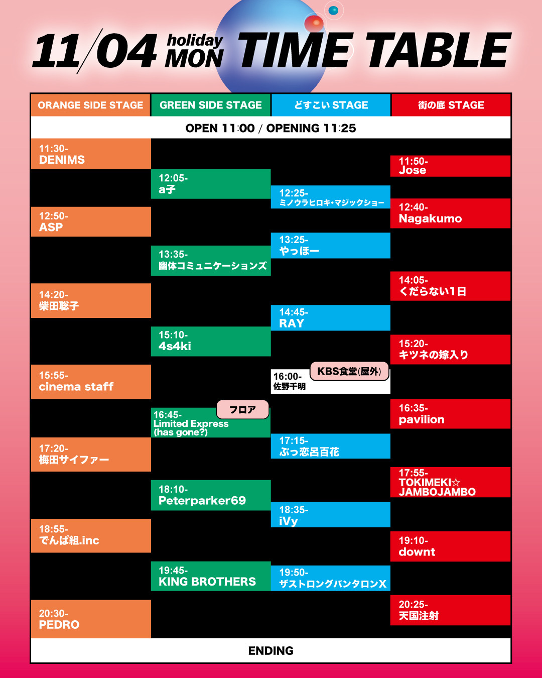 また、KBS食堂(屋外)にステージが登場。2日はみっちー(シンガロンパレード)、3日は特別イベント「ーいま話したい、あの日からのこと、能登半島のことー」、4日は佐野千明が出演する。4日のKBSホール内ではLimited Express (has gone?)がフロアライブを決行予定。
