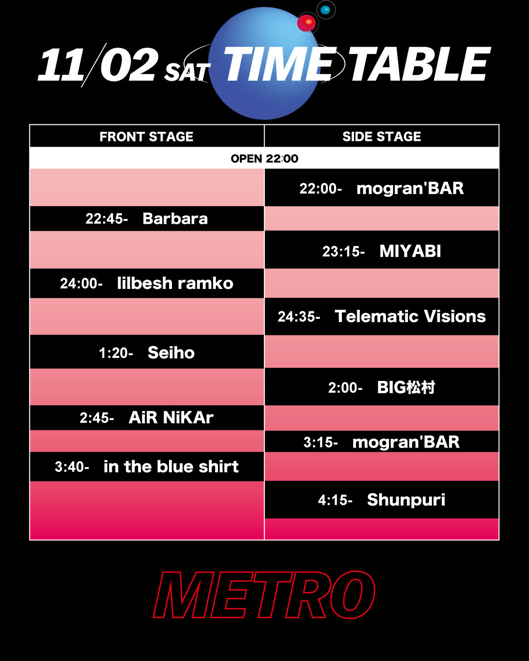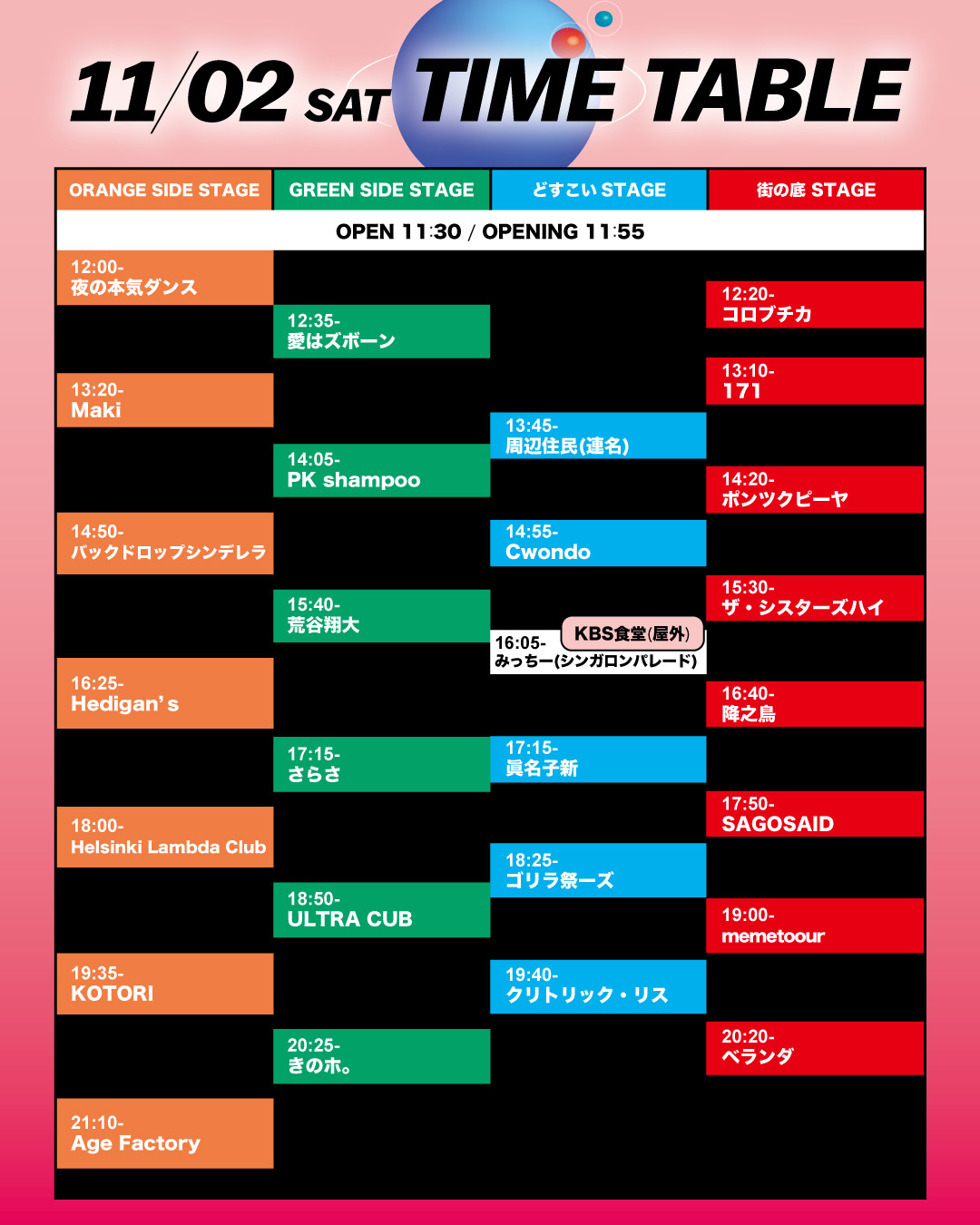 京都KBSホールでは「ORANGE SIDE STAGE」、「GREEN SIDE STAGE」、「どすこい STAGE」、「街の底 STAGE」の4ステージ。京都Club METROでは午前5時まで熱いパフォーマンスが繰り広げられる。『ボロフェスタ2024』の各日程のトリを務めるのは、11月2日がAge Factory、3日がMOROHA、最終日4日はPEDROが大トリを飾る。京都Club METROは、Seihoを中心に、盛り上がりが加速する流れが組まれている。