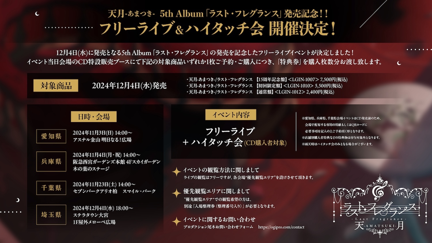 12月4日(水)に発売となる天月-あまつき- 5th Album『ラスト・フレグランス』の発売を記念したフリーライブ&ハイタッチ会の開催が決定した。