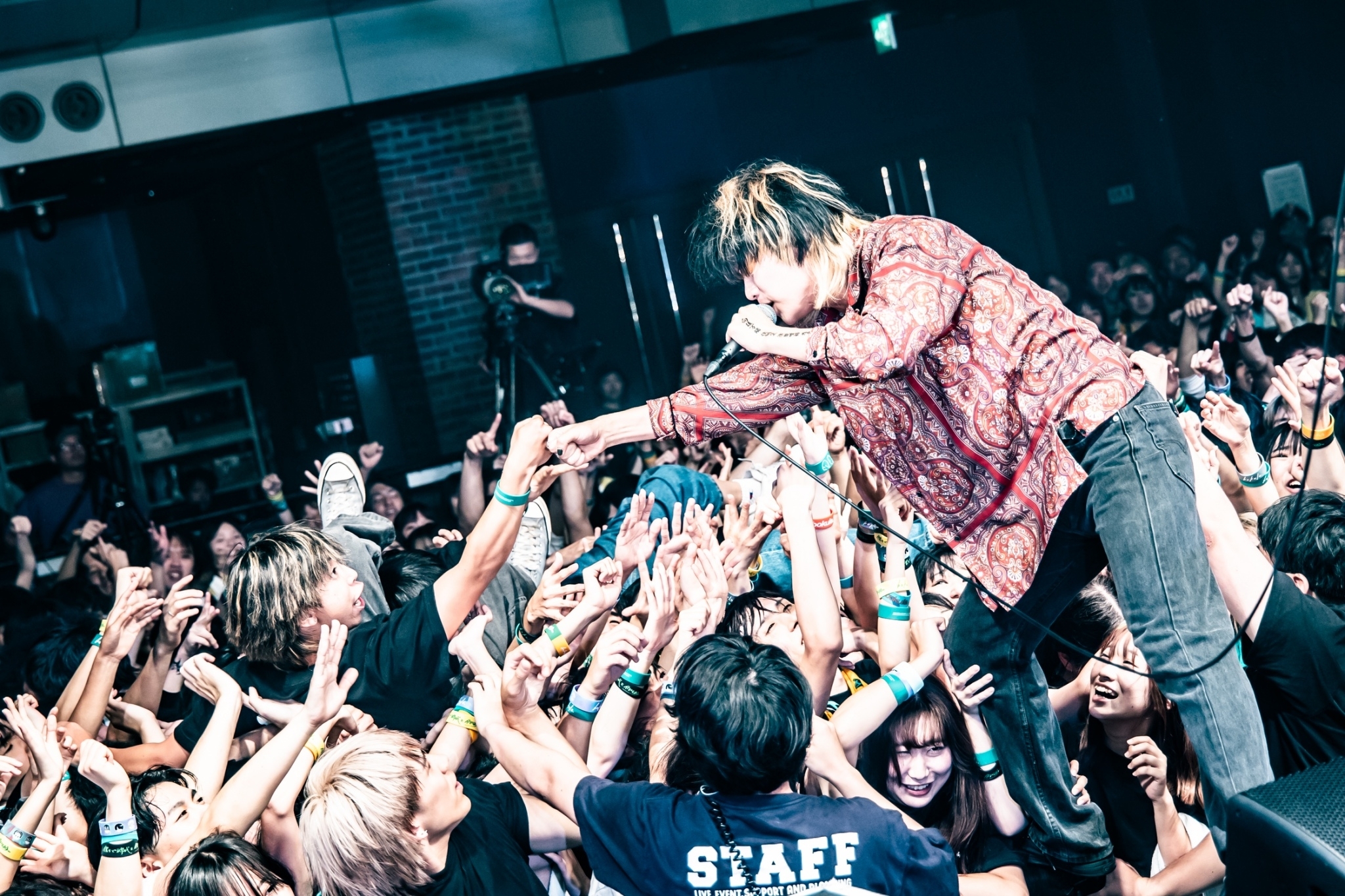 「俺、緊張しとると毎回さとぴーに心臓に手を当ててもらう」――かじの可愛らしい発言が、「カップルか!」という総ツッコミを受けていたMCタイム。演奏中は圧倒的にかっこいいが、トークを始めると親しみやすいお兄ちゃんに戻る4人であることを再確認したひと時を経て、ライブは後半へと突入していった。大合唱を巻き起こした「夏の迷惑」。酩酊感を誘う妖しいエネルギーの塊「怪火」。シャープなビートが刻まれまくった「青くね」、「若者が全て.」「アブノーマル」「いつ失ってもいいように.」「バイマイフレンド」が届けられてから迎えたMCタイム。楽しんでくれている観客に対する感謝を「ありがとう」以外で言い表すにはどうしたらいいのか、えいは一生懸命に言葉を探していた。「本当に君たちはすごいね。かっこいいと思います。いろんな音楽の文化がある中で、毒を吐いて戦う文化が大嫌いです。だから俺たちはこのスタイルを変えるつもりはありません。俺たちはもともとこういう音楽をやりたかった。こういうフロアを作りたかった。こういうライブハウスを作りたかった。今日君たちと俺たちが証明しました!」と語った後、年明けの1月から全国9ヶ所を巡る全国ツアーが開催される旨が発表された。そしてライブ本編は、いよいよクライマックスへ突入。フロアから届けられた大合唱をメンバーたちが心底嬉しそうに浴びていた「愛してやまない一生を.」。激しい手拍子とクラウドサーフの続発が凄まじいことになっていた「群青謳歌」。4人のユニゾンの歌、えい、かじによるギターソロも交えながら怒涛の展開を重ねた「こんな僕ですが、何卒」……燃え上がるかのように本編は締め括られた。