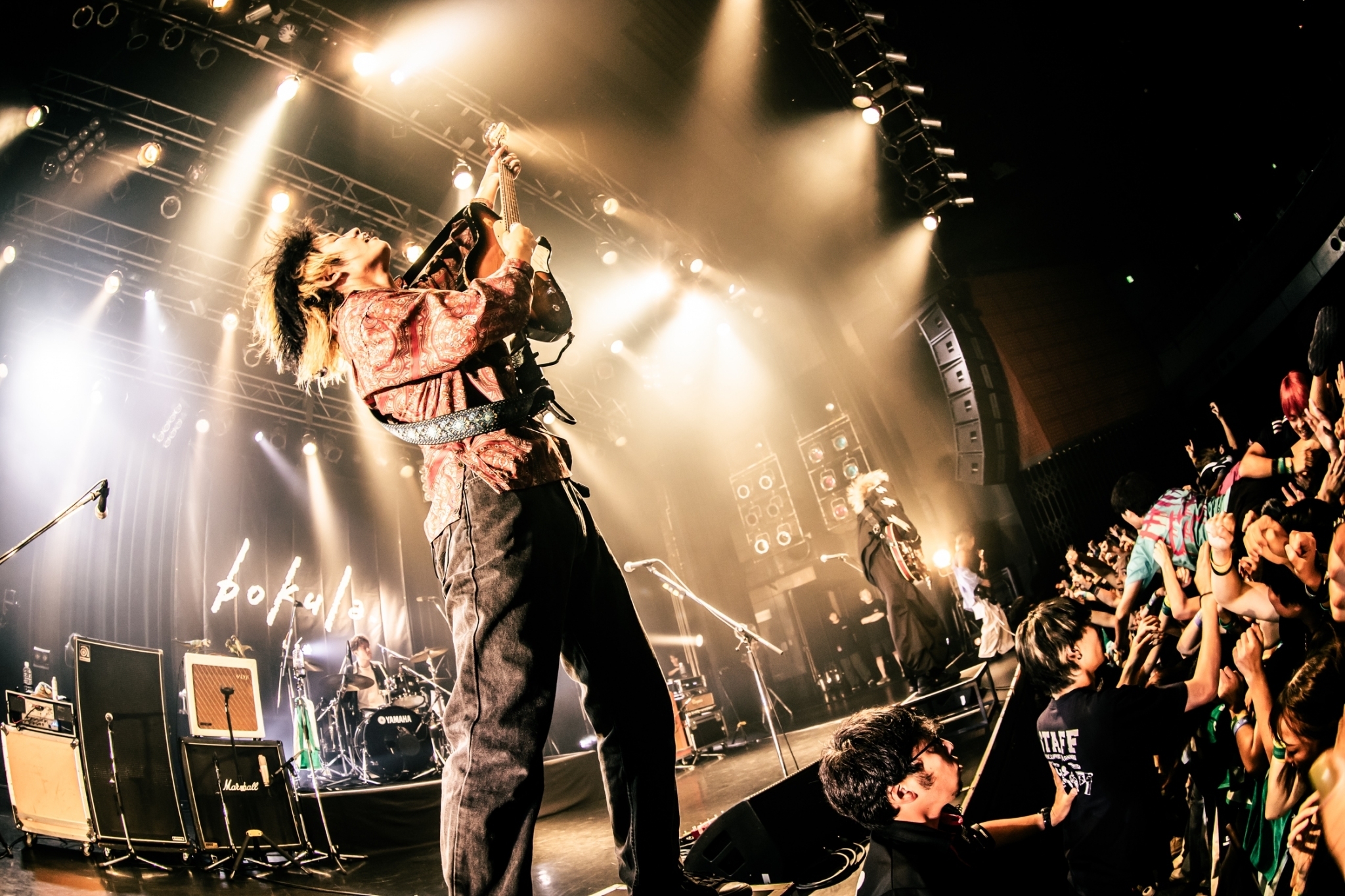えい(Gt&Vo) 、かじ(Gt)、さとぴー(Ba)、ふじいしゅんすけ(Dr)がステージに登場した時点で、既に演奏がスタートしているかのような手拍子、歓声、叫びで満たされたO-EAST。そしてオープニングを「2001」が飾ったことによって、熱気の限界突破がスタートした。掲げられた拳が激しく揺れるフロアの風景が美しい。続いて 「不完ロマンス」と「足りない二人」も連発されて、汗だくになった人々の身体から湯気が立ち上る。ライブを心待ちにしていたファンがたくさん集っていることを、序盤の3曲の時点で実感させられた。