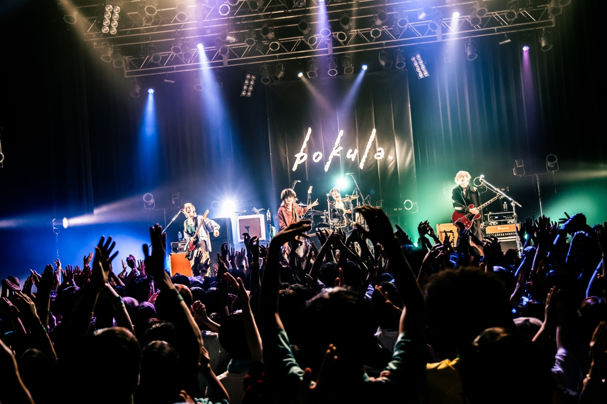 アッパーな曲が続いた前半で会場内のムードを瑞々しいものに転じたのが、穏やかなビート、哀愁が滲むメロディが響き渡った「最愛のゆくえ.」。えいのギターと歌から始まり、かじ、さとぴー、しゅんすけの演奏が合流した瞬間に美しいアンサンブルが構築された「ルーツ&ワープ」。透明感に満ちたサウンドを、観客がじっくりと受け止めていた「マリーユース」……bokula.の音楽の多彩さを示す歌と演奏が続いた。