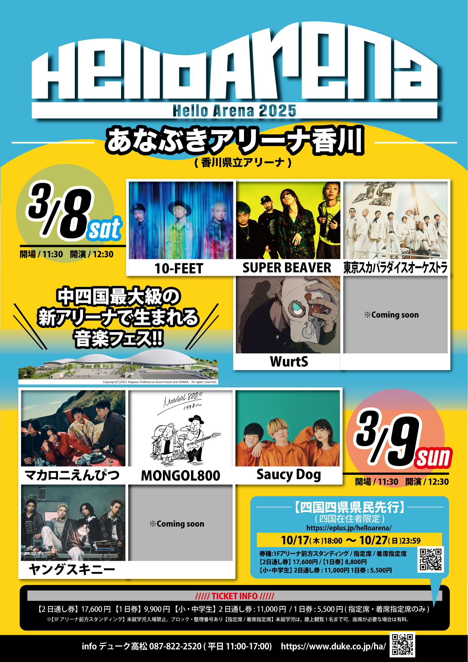 今回発表された出演アーティストは、3月8日(土)に10-FEET、SUPER BEAVER、東京スカパラダイスオーケストラ、WurtS。3月9日(日)にマカロニえんぴつ、MONGOL800、Saucy Dog、ヤングスキニー。各日、さらに追加アーティストが1組ずつ後日発表される予定となっている。新しいアリーナと、より一層盛り上がる(盛り上げる)高松の音楽シーンの門出を見届けよう。
