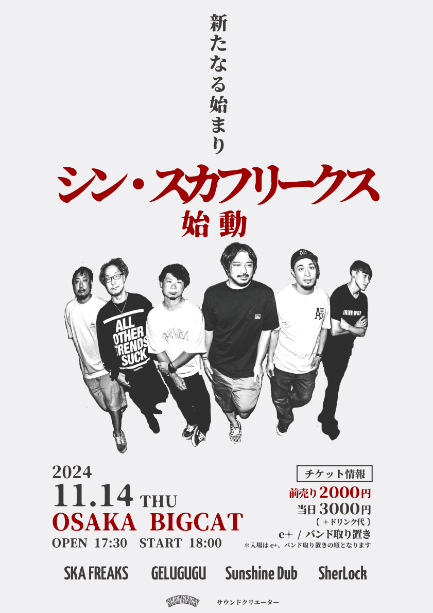 滋賀県発のスカパンクバンドのSKA FREAKS。今回新たに加入したメンバーはYuma(Dr)、TAKAO(Ba)、Katch(Alto-Sax)の3名。現メンバー3名に加えて、フルメンバー6人でのSKA FREAKSが再始動する。これに伴い、11月14日(木)に大阪BIG CATにて初の自主企画『SKA FREAKS presents シン・スカフリークス』の開催が決定。新メンバーもここでお披露目される。