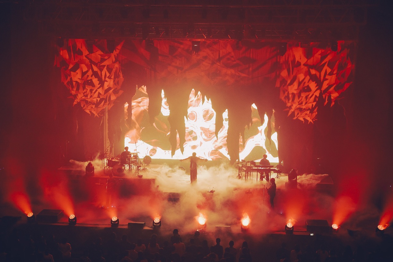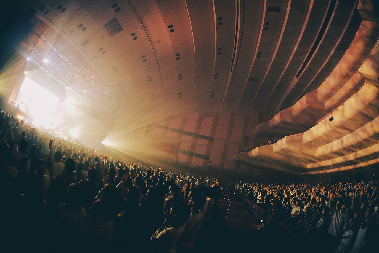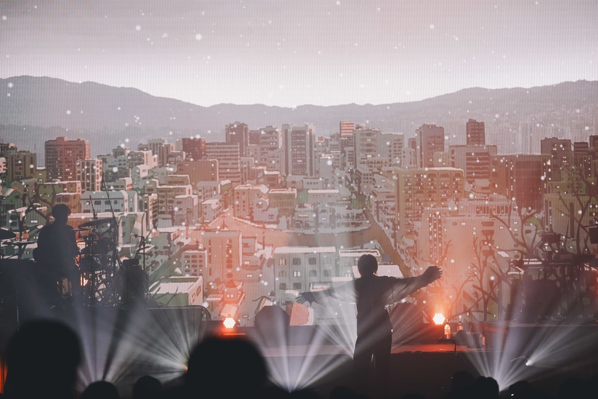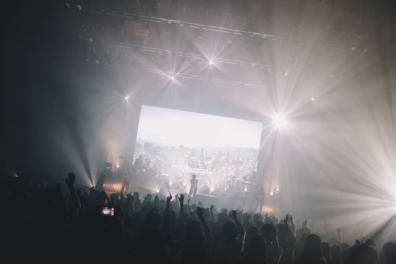 クライマックスは「ブチ上げるためのロックな曲が足りないと思ってね」と、さらなる新曲「IN_MY_HEAD」を用意。パカッと割れた脳のイラストやカラフルな文字列が映されるサイケデリックなCGとともに衝動的な音塊で突っ走り(間奏で来場者への感謝のメッセージをスクリーンに表示!)、客席にタオル回しを沸き起こす興奮の坩堝へと誘う。そのまま高速4つ打ちが炸裂する「絶対零度」になだれ込み、今出せるすべてを出し切るように「エウレカ」までアッパーチューンを畳みかけたのち、ピークに達した熱量を「Cult.」で小気味よくクールダウンさせるという、緩急自在のパフォーマンスにも舌を巻く。