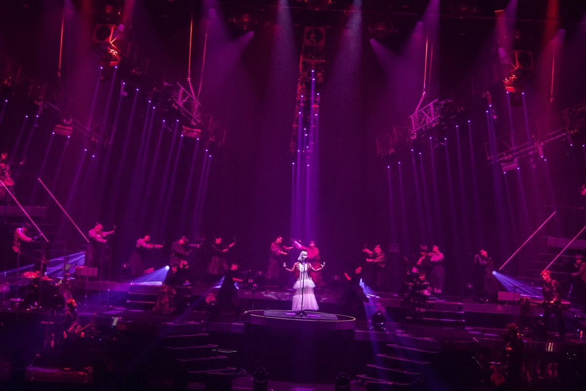 ReoNaの号令とともに座っていた客席は一斉に立ち上がり、ラストスパートが始まる。今だけはすべてを忘れて踊りましょう…シャドウダンサーズ20人を引き連れての「シャル・ウィ・ダンス?」では自身もタップを披露する。ダンサーが多層構造のステージに居るだけで、まるでミュージカルの舞台のようだ。会場を埋め尽くした観客もReoNaやダンサーとともに踊り、今まで以上に会場が一つになっていく。「レ・ミゼラブル」を「ああ無情」と訳したのは明治時代の翻訳家黒岩涙香だが、どこかその言葉が似合うような泡沫の享楽が展開されていく。