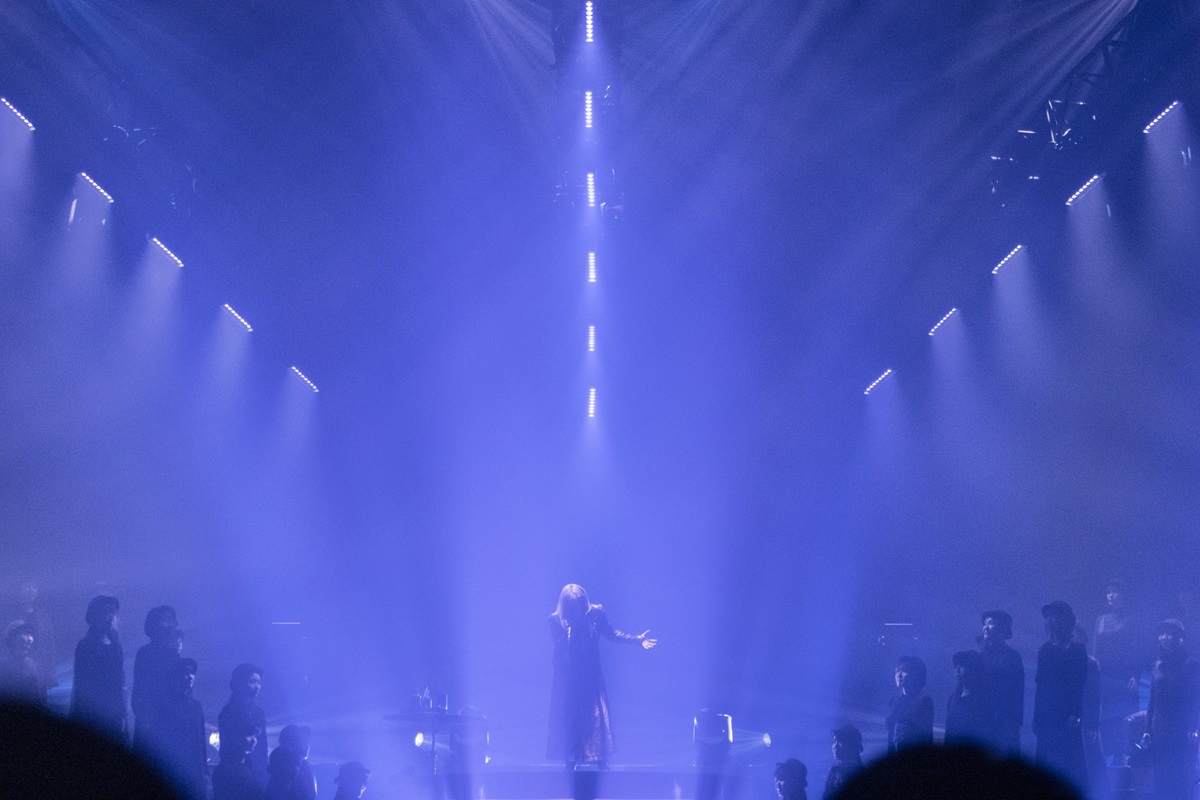 青いレーザーの中、ゆらり蜃気楼のようにステージに登壇したReoNaの選んだ一曲目は「BIRTHDAY」。生まれた日、新しい一年の始まり、それを盛大にお祝いするというわけではなく、あくまでも痛みの先に生まれる明日への希望のステップの一日。