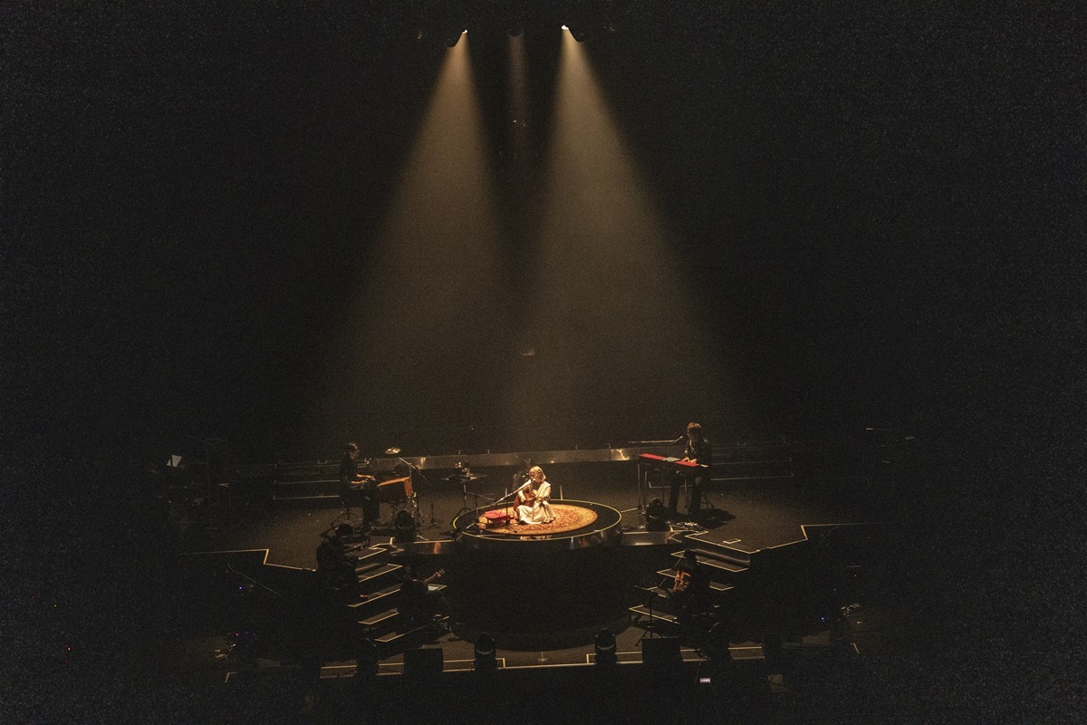 長い暗転が開けると、ReoNaはすっとステージの中央にあぐらをかいて座っていた、バンドメンバーも階段に座るなどして、ぐっと近くに寄っている。