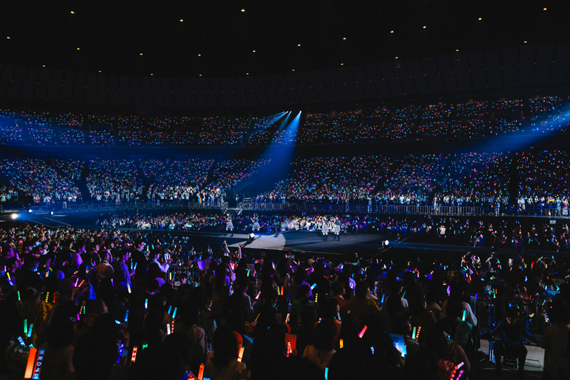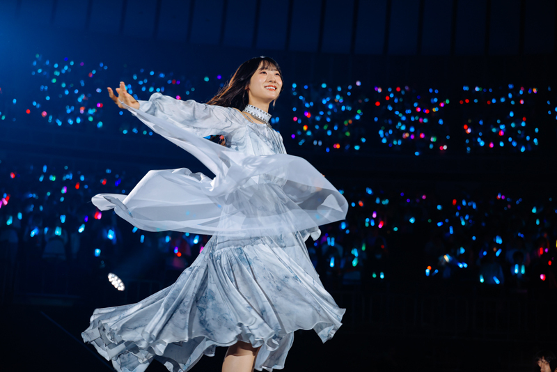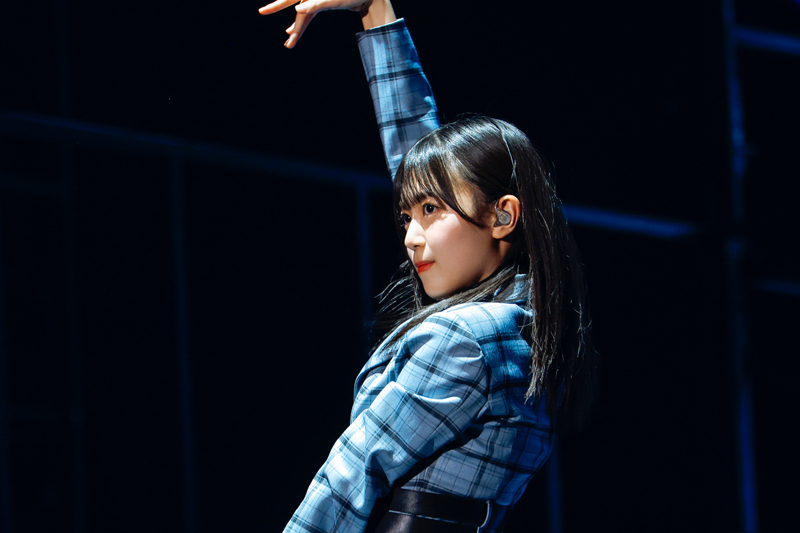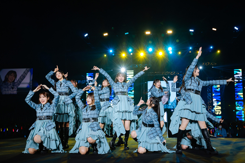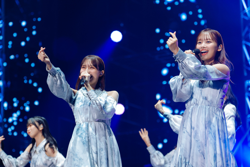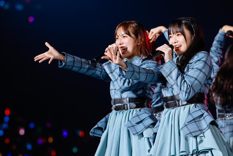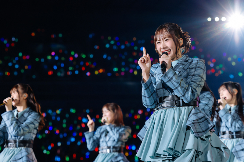 続くパートの「何度でも何度でも」では、メンバーたちがスタンド側の通路を歩きながら歌唱。客席から1m程度の距離で手を振りながら、ファンとコミュニケーションをした。曲中には、センターを務めた石塚瑶季が「私は、みなさんと一緒に作るライブ、そしてこの美しい景色が好きです。今日は、いつもいただいている愛情を1億倍にしてお返しします」とマイクした。