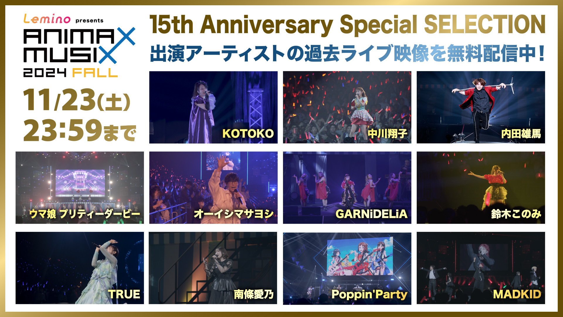 また、本日より『ANIMAX MUSIX 15th Anniversary Special SELECTION』の配信も開始。過去にANIMAX MUSIXに出演したオーイシマサヨシやウマ娘 プリティーダービーなど全11組のアーティストのライブ映像を無料で楽しめる。