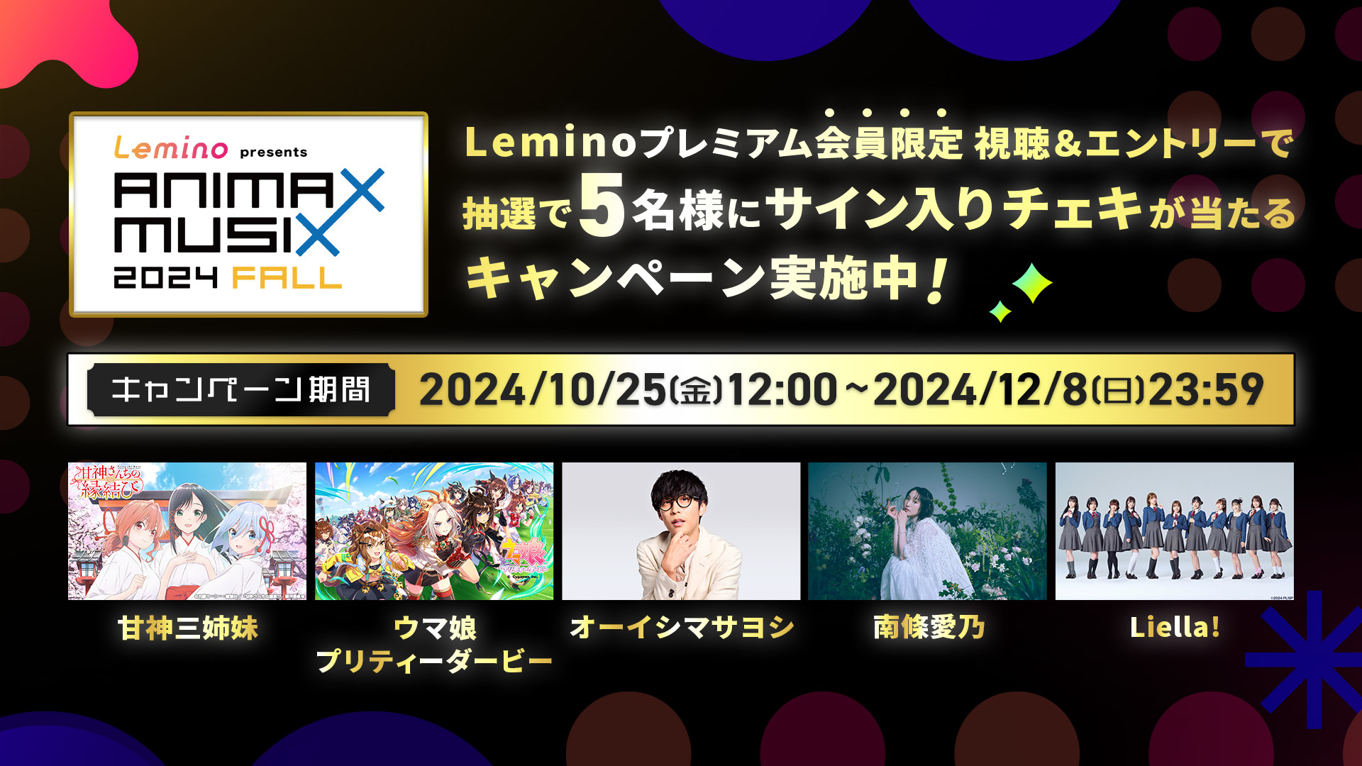 さらにLeminoプレミアムに入会し、『Lemino presents ANIMAX MUSIX 2024 FALL』生配信または見逃し配信を視聴した人の中から抽選で5名に、出演アーティストのサイン入りチェキがプレゼントされるLeminoプレミアム入会キャンペーンも開催。詳しくはLemino特設サイトを確認してほしい。