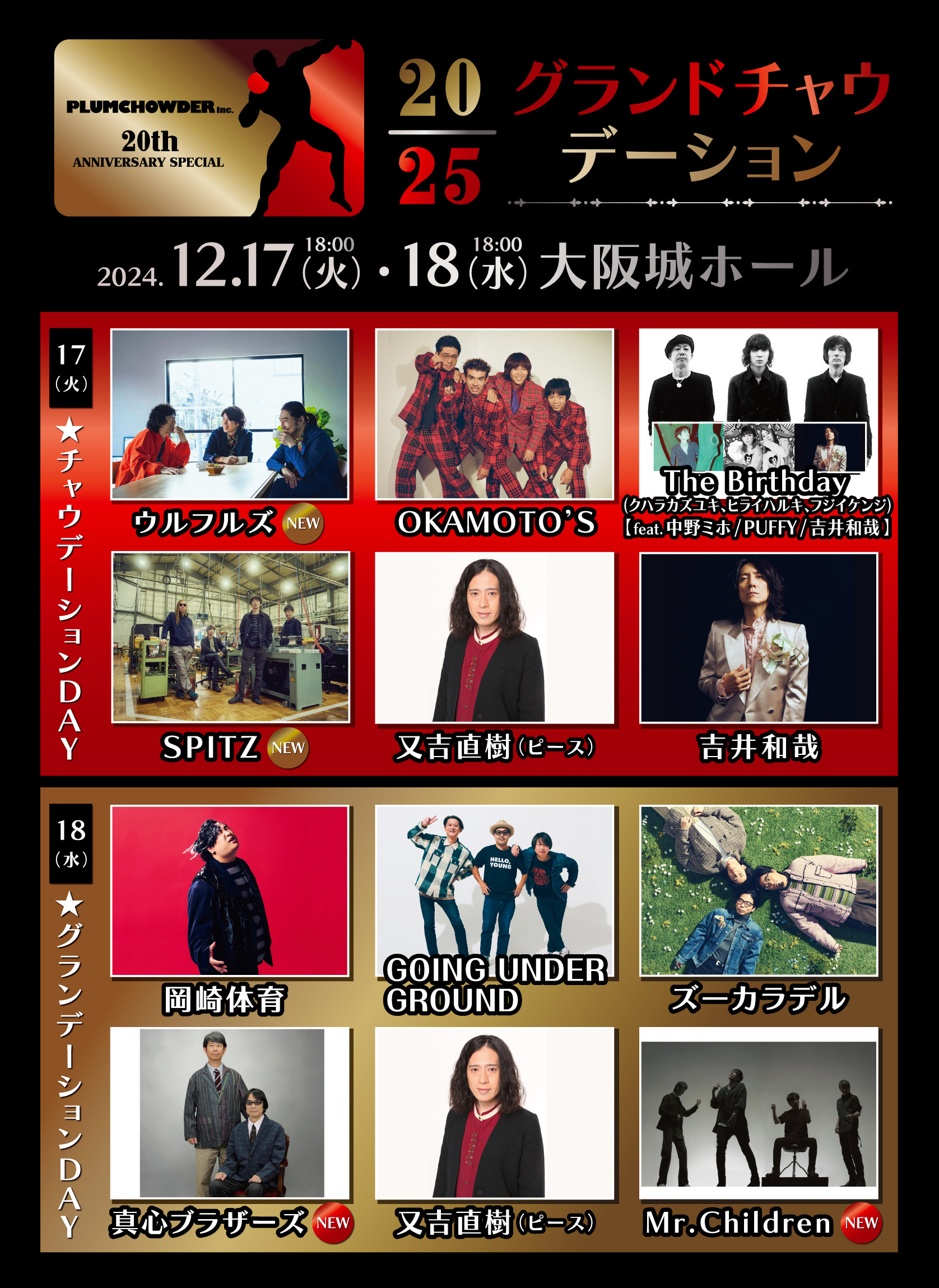 同イベントは、大阪を拠点に、コンサートプロモーションやイベント企画制作、『ロックロックこんにちは!』などの主催ライブイベントを開催してきたPLUMCHOWDERの誕生25周年、会社設立20周年を記念したもの。今回の発表により1日目「チャウデーションDAY」にウルフルズ、SPITZの2組、2日目「グランデーションDAY」に真心ブラザーズ、Mr.Childrenの2組の出演が決定した。