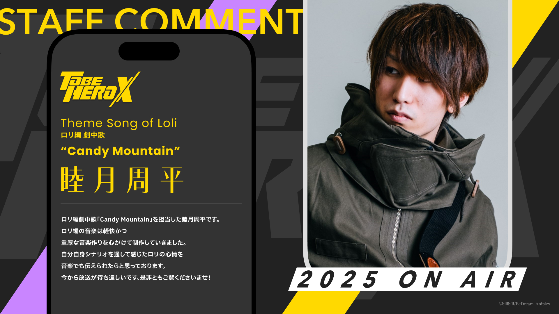 ロリ編劇中歌「Candy Mountain」を担当した睦月周平です。ロリ編の音楽は軽快かつ重厚な音楽作りを心がけて制作していきました。自分自身シナリオを通して感じたロリの心情を音楽でも伝えられたらと思っております。今から放送が待ち遠しいです、是非ともご覧くださいませ!