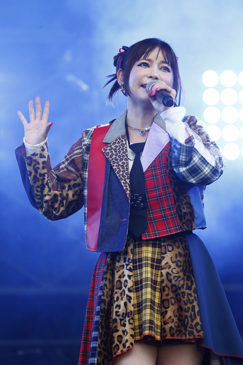 疾走感あふれる「空色デイズ」でスタートした中川翔子のステージ。長編VR映画『機動戦士ガンダム:銀灰の幻影』主題歌であり、11月20日(水)発売の新曲「ACROSS THE WORLD」を披露。「pretty please chocolate on top」と「rainbow forecast」では、“しょこたんフェス”への参加や『Shoko Nakagawa Birthday LIVE 2024 さんきゅう(年齢非公表)』のオープニングアクトを務めたWE3Mがバックダンサーを務め、一緒にダンスを披露し華やかでパワフルなステージとなった。歌い終えると「いい感じで汗をかいてきました。おにぎり1個分くらいはかいてるかな。歌っている瞬間に空の色が変わっていくなんてエモいね。山の色も染まってきて、中野区(東京)では見られない景色が広がっています。今日は新潟の皆に出会えてすごく幸せなので、最後の歌に行く前に皆と約束を。絶対また会えるようにこれからも頑張ります!」とトークし、「RAY OF LIGHT」や「ドリドリ」などアニメファンや子どもたちにも人気の曲で会場を盛り上げた。