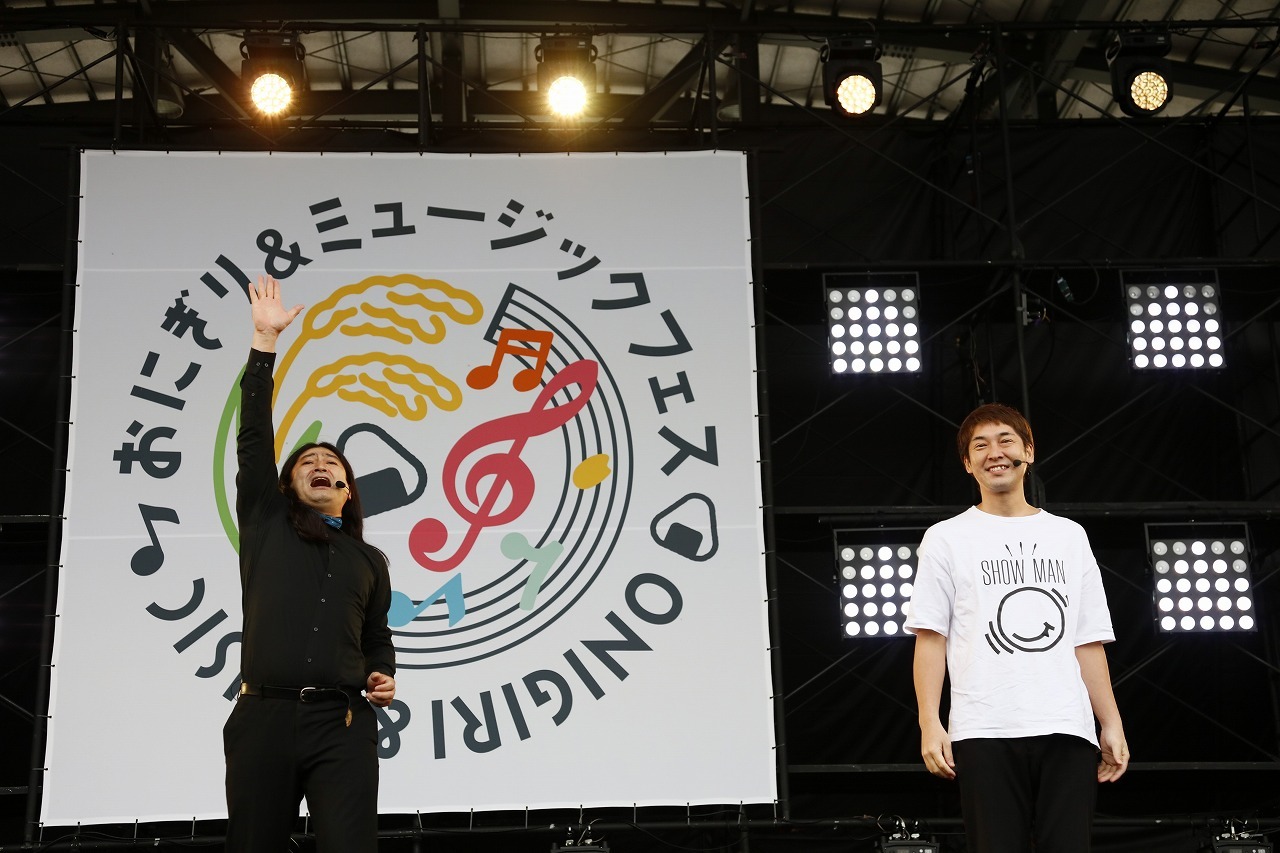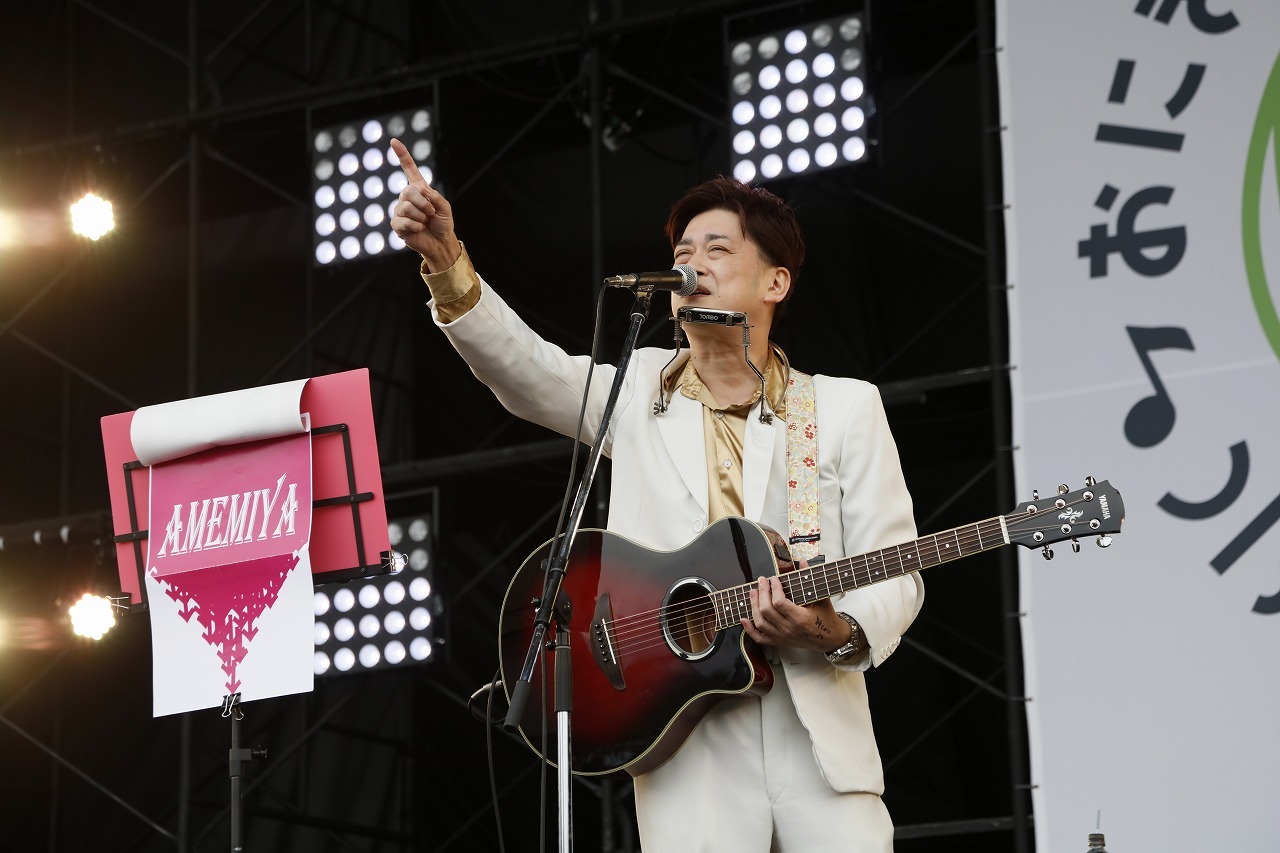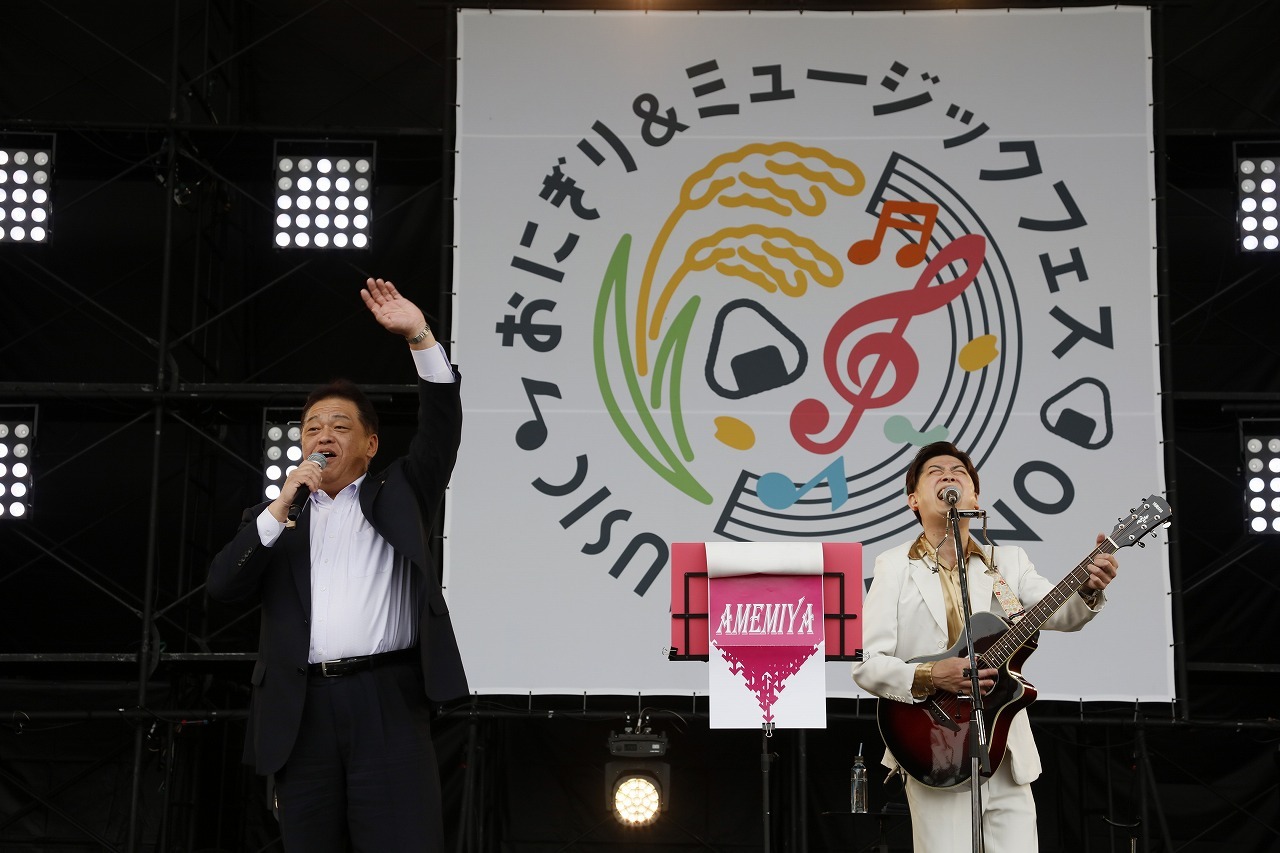 AMEMIYAがこぶしを挙げて登場すると会場から大きな拍手が起き、「生まれてきて一番テンションが上がってます。幸せです。ありがとう。小さい頃から夢がありました。それは必ず制覇したいステージ3つ。1つめは紅白歌合戦、2つめはFNS歌謡祭、そして何と言っても3つめは『おにぎり&ミュージックフェス』です。夢が叶いました。こういうフェスが生まれるのを待っていました。ありがとう!」とトークをした後、市長をステージに呼び込む。市長が「今日は南魚沼に多くの皆さんに来ていただいて、ありがとうございました。生まれた時からこのフェスを考えておりました」と話すと、AMEMIYAが「さすが!」と笑う。そして、「おにぎりはおいしい。絶対におにぎり食べてほしい。そして、このミュージックフェスはじまるんですよ」というAMEMIYAの言葉を合図に、市長とともに「『おにぎり&ミュージックフェス』始めます~♪」と代名詞的な楽曲を歌唱して華々しくフェスをスタートした。