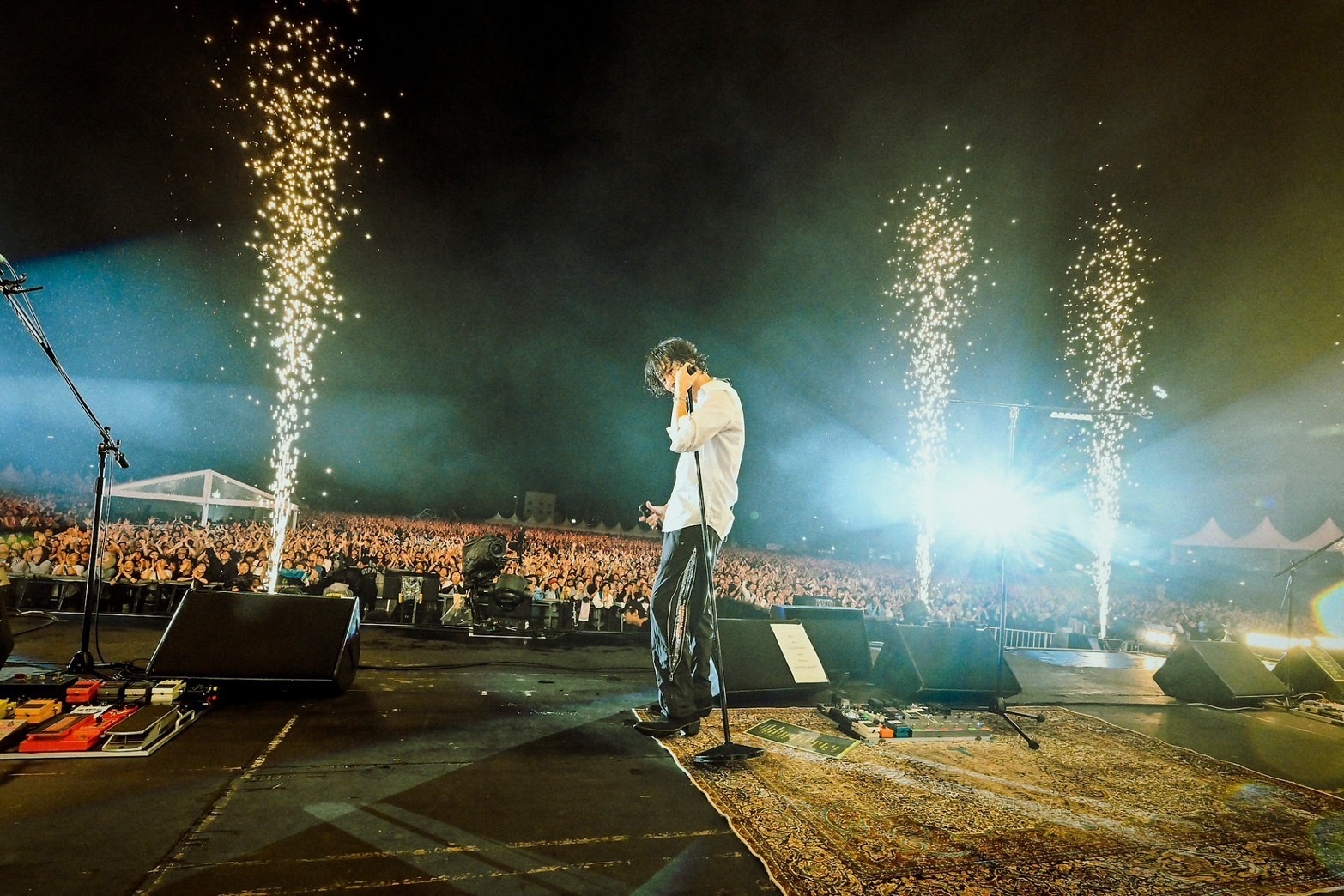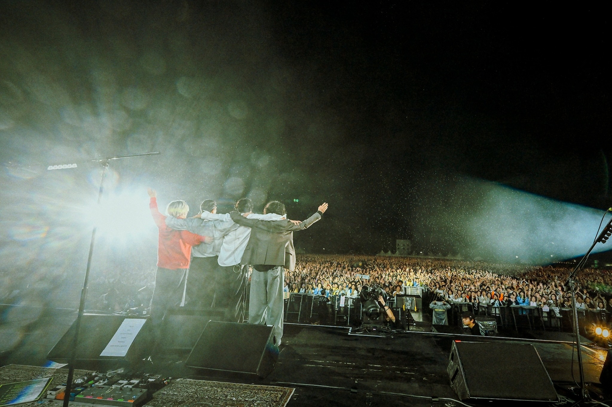 「2日目だけど全然慣れません。相模原でこんな景色が見られるなんて!」その口ぶりから、この2日間の光景が相模原に生まれたことが本当に魔法のようなことなのだと実感する。“Backseat”“Run Away”とメロディアスな楽曲たちを披露すると、川上は「もっともっと続いていくフェスにしたいと思います」と未来に向けた意志を告げた。ラストは“閃光”、そして“ワタリドリ”が、この2日間に刻まれた数多の想いと景色を空に解き放つように壮大に奏でられる。“ワタリドリ”の演奏終わりには、夜空に色鮮やかな花火が。肩を組み挨拶をした4人がステージを去った後、昨日発表された来春のニューアルバムに続き、モニターには新アーティストビジュアル、さらに「次はワンマンツアーで会いましょう」の言葉。5月2日(金)SENDAI GIGSを皮切りに全国18箇所24公演を行う『[Alexandros] Tour 2025 (仮)』の開催が決定した。
