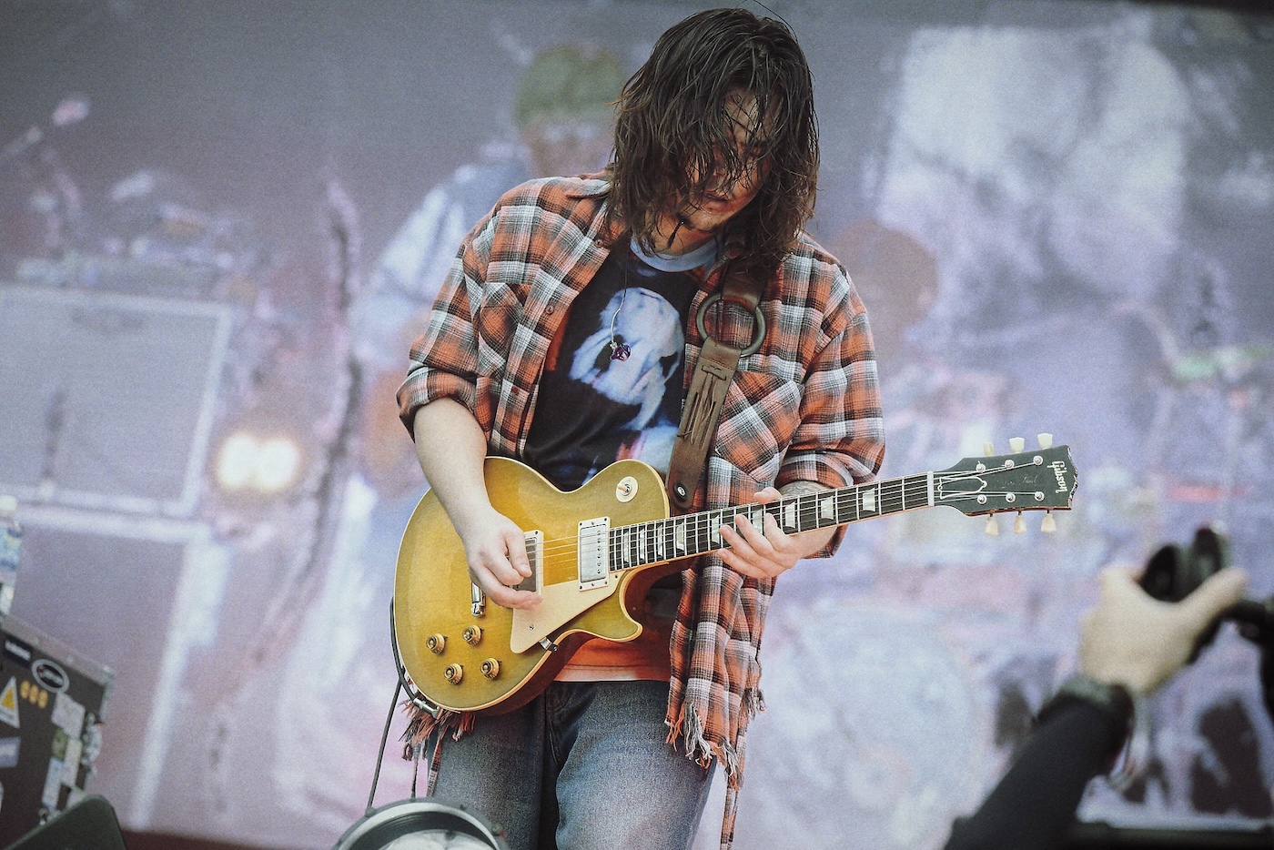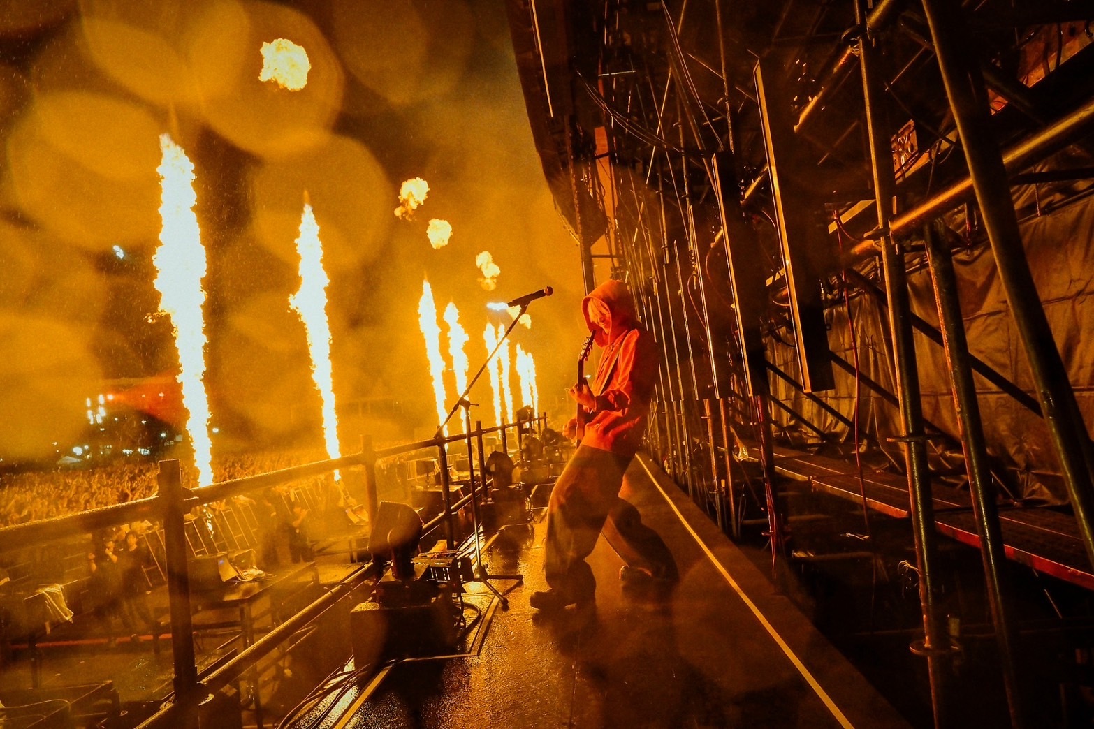 2日目のトリ、つまり2日間にわたったTHIS FES’ 24の大トリを飾ったのは、主催者[Alexandros]。小雨が降る中、ライブがはじまる直前に爆音で流れたOASISの”Don’t Look Back in Anger”のライブ音源で、空間は一気に緊張と高揚に包まれる。ステージに掲げた自らのバンドロゴと、「THIS FES」のロゴ、そして2日間にわたりすべての出演者の名前を包み込んだ[ ]のネオンライトを背負い、ステージに登場した[Alexandros]の4人。1曲目は“Adventure”。青い照明がさらさらと雨に濡れる空間を鮮やかに彩り、バンドの確かなグルーヴと観客たちの合唱が重なって、絶景が生まれる。演奏の終わり際、川上がマイクスタンドを掴んで掲げた――美しい光景だ。立て続けに“Waitress, Waitress!”へ。「遂に雨が降ってきてしまいました! お待ちかねの雨です!」と川上が語り掛けると、大歓声で応えるオーディエンス。「いい声出すなあ。イヤモニ外していいか? その声もっと聞かせてくれ!」そう言って“Starrrrrrr”、さらに“Kick&Spin”へ。「相模原に最高のアーティストを連れてきたぜ!」――「1 CHANCE FESTIVAL」でのWANIMAにリスペクトとオマージュを込めた言葉で、川上は2日間に集まった出演者たちへの誇りと感謝を告げる。続く“VANILLA SKY ”ではWurtSがサプライズ登場し、川上と幸福なデュエットを披露した。そして強烈な照明演出と共に放たれた“Girl A”と“Boy Fearless”の2曲で、自然豊かな相模原は没入感溢れる異次元空間に染め上げられる。