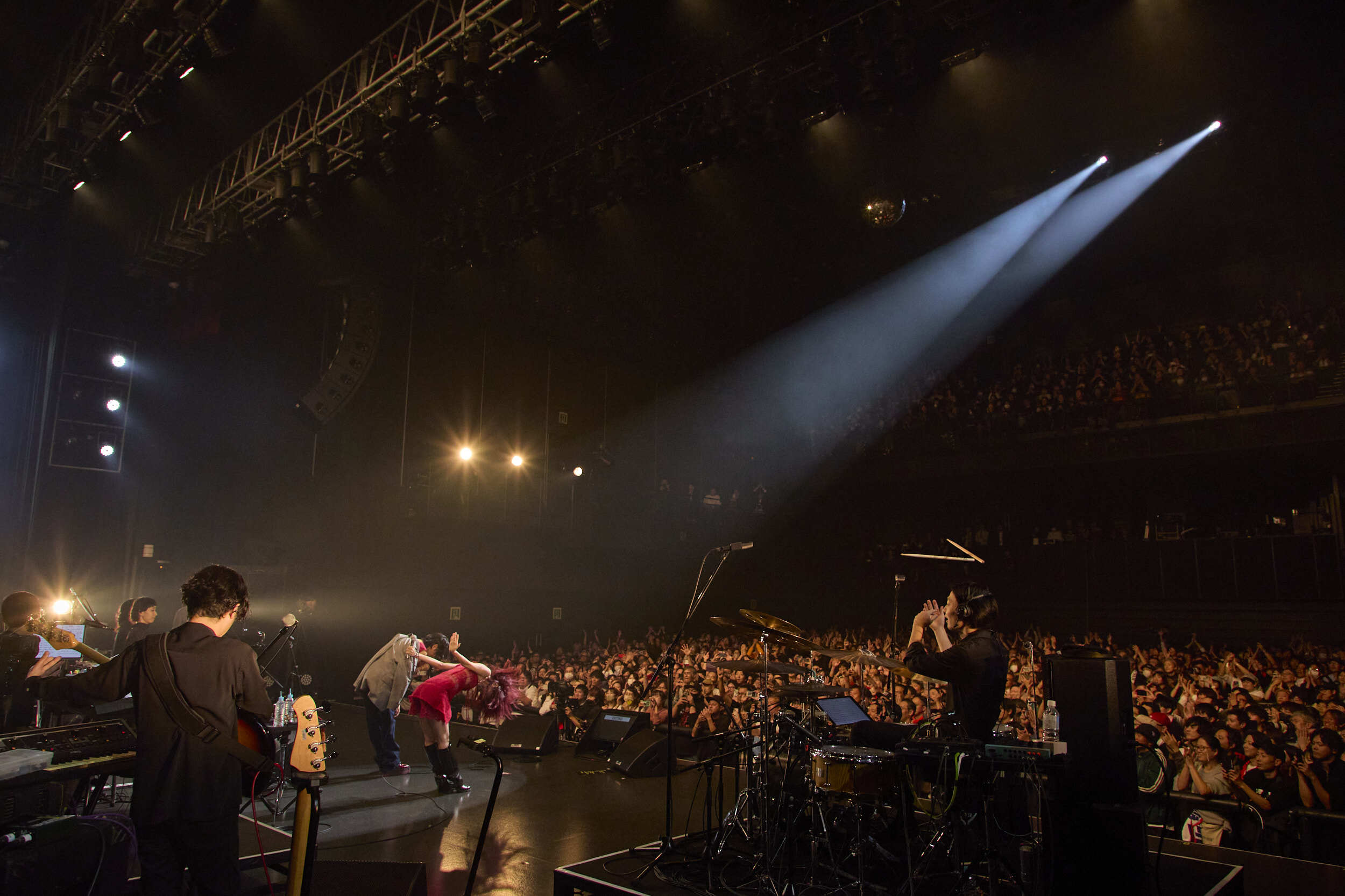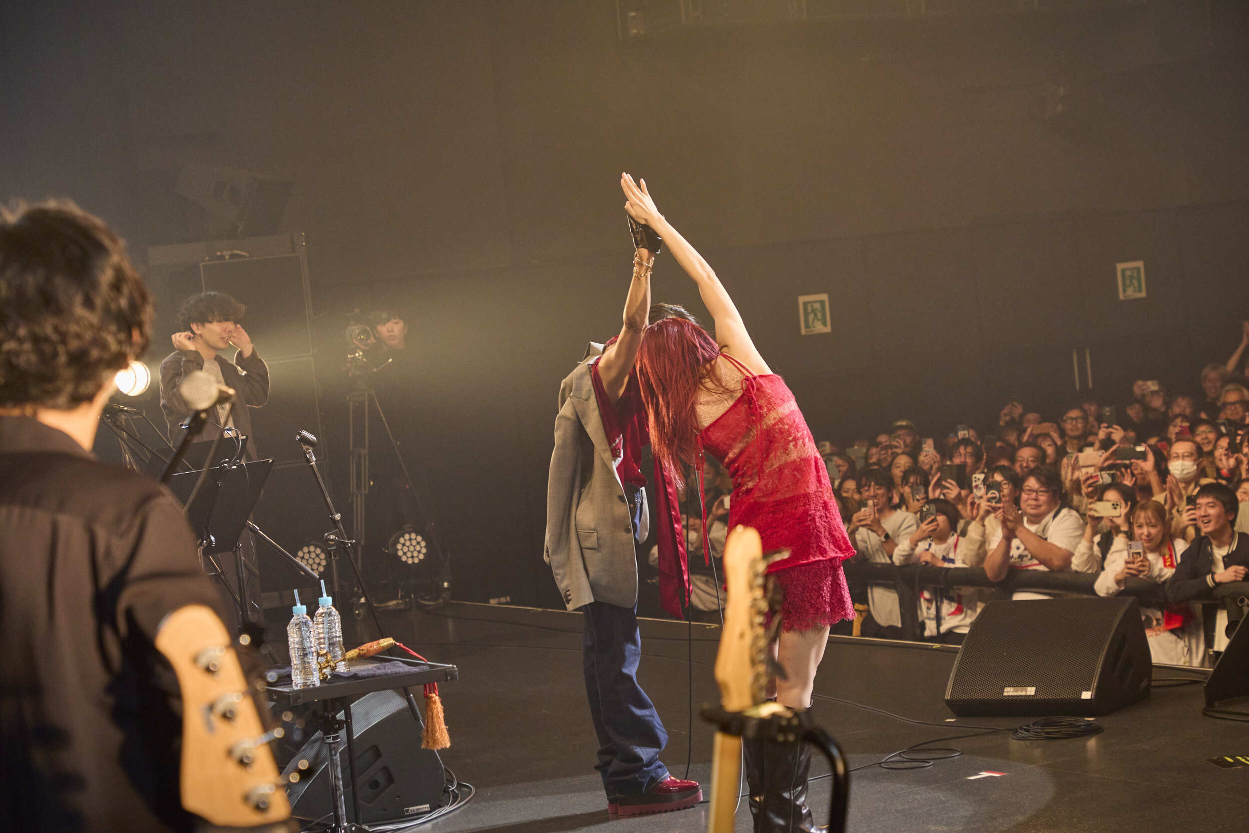 「今日は運命の夜だと思ってます。大好きなアイナとこんな夜を過ごせるなんて信じられない。アイナと六本木心中よ!……ウソウソ(笑)」と、くだけた調子のMCから唐突に流れたしたイントロがあの「情熱」なのだから堪らない。パワフルさと繊細さがトレードオフの関係になっていない生命力に満ち溢れた歌声と、遊び心も忍ばせたフリーキーな歌唱スタイルとアレンジ。極上のグルーヴを生み出すバンド陣の演奏。ステージ上から放たれるもの全てに刮目する時間となった。さらに畳み掛けるように「アイナっちの名曲を──」と披露したのは「粧し込んだ日にかぎって」だ。2番に差し掛かったタイミングではアイナが現れ、コンテンポラリーなダンスで魅了。ラスト、アイナにもたれかかったUAが耳打ちするように<愛してるよ>と歌い、アイナがその頭をそっと撫でる一幕はまるで名画のワンシーンのようであった。