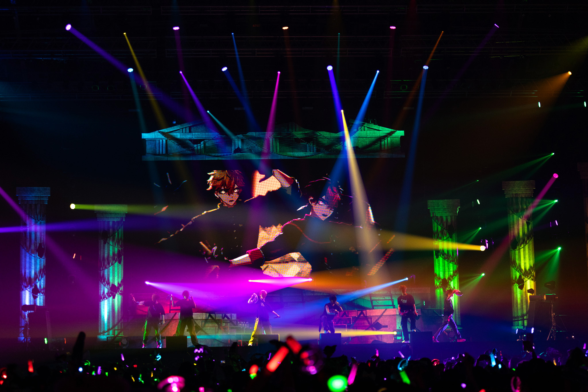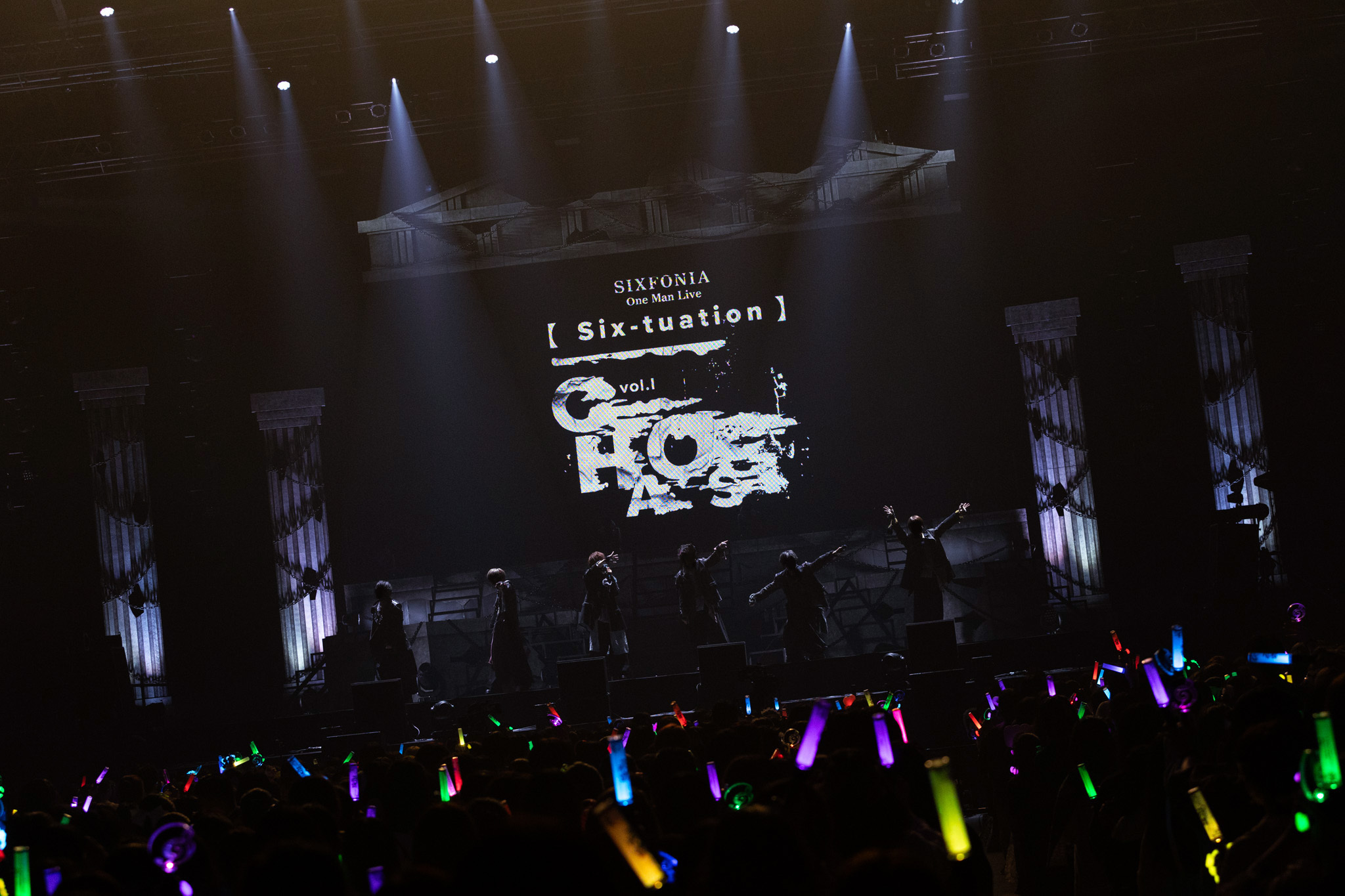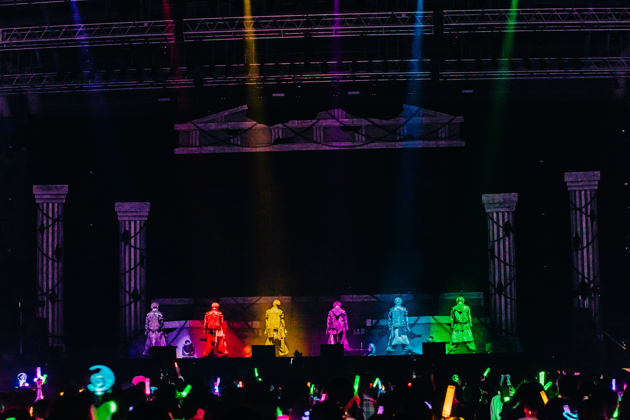 2日間で約16,000人を動員した今回のライブ、もちろん客席は超満員だ。オープニング映像に続き、ギリシャ建築柱がそびえるステージに姿を現し後ろ向きに横並びとなった6人。暇72(ひまなつ)は赤、雨乃こさめは水色、いるまは紫、LANはピンク、すちは緑、みことは黄色と、スタイリッシュな新衣装をまとったそれぞれの背中がメンバーカラーのライトを浴びると、シクファミ(シクフォニファンの呼称)が大歓声を上げる。すかさずの1曲目は、2024年10月5日に動画公開された「Sledgehammer」だ。気迫に満ちた歌とフォーメーションダンスでいきなり圧倒する6人は、歌詞さながら“王”の風格を漂わせている。<妥協はしない><怯まない>6人の精神性を宿した「d0gmq」、それぞれの個性と<天上天下唯我独尊!!!>ぶりを思い知る「SHALL WE GONG!?!? -1st battle-」とたたみかければ、メンバーカラーのペンライトを大きく振るシクファミの熱狂も加速していく。