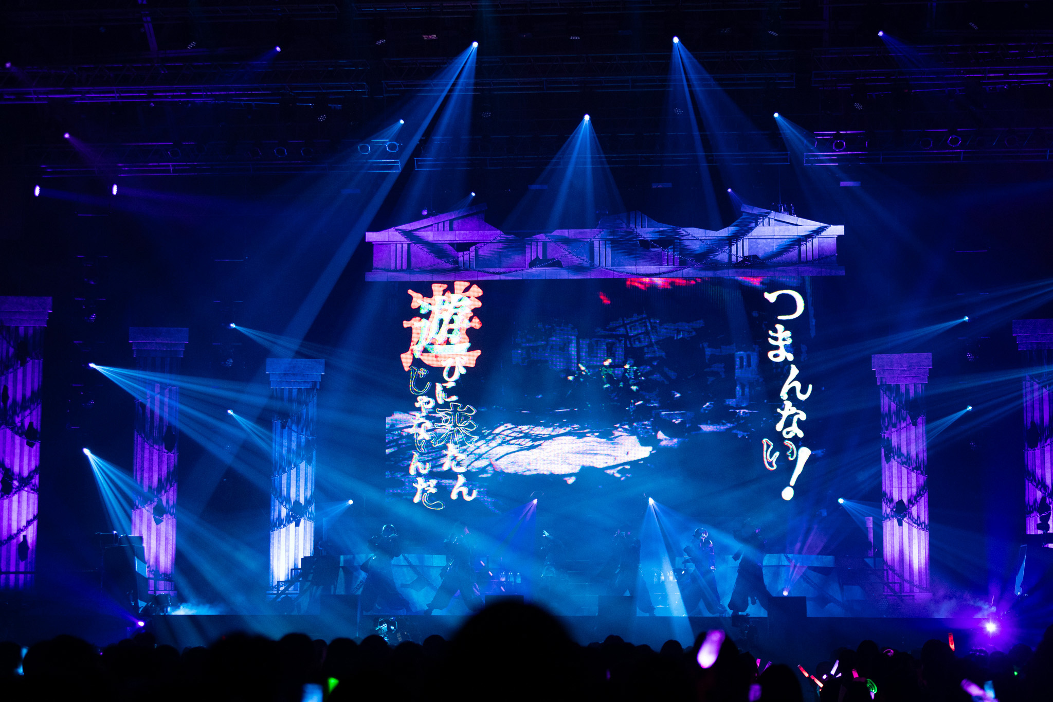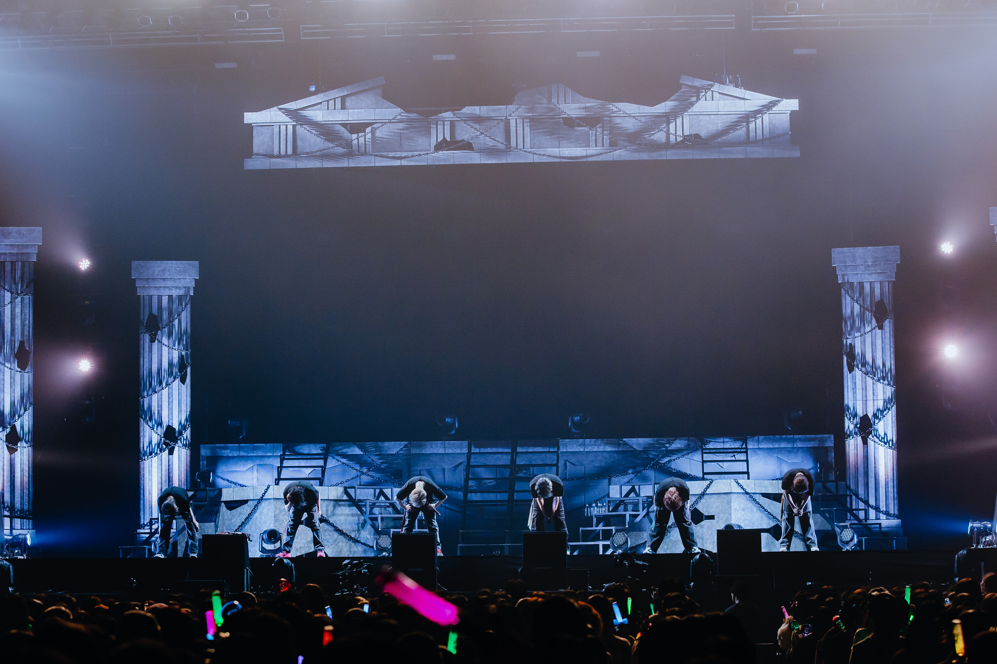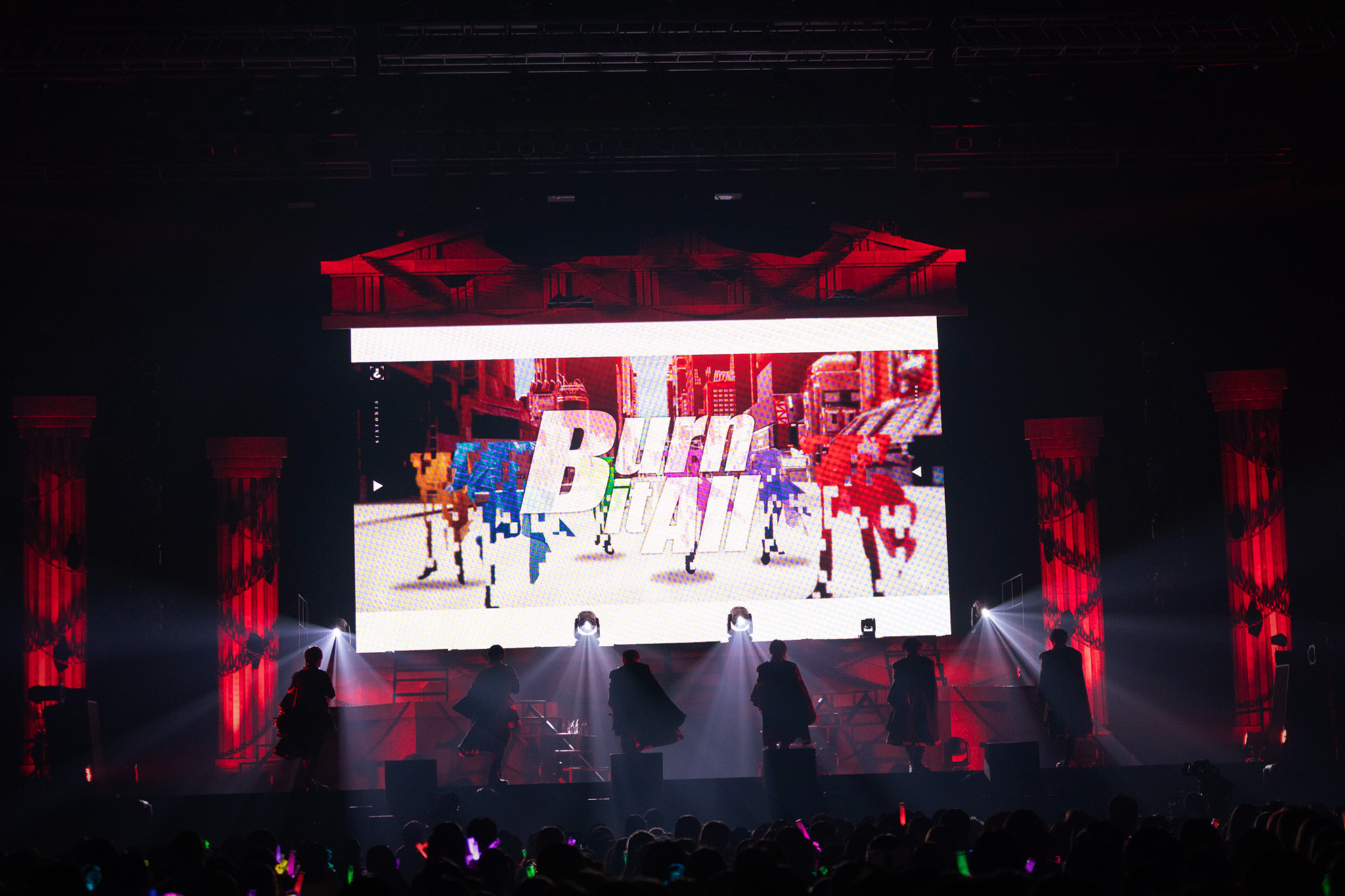 2日間で約16,000人を動員した今回のライブ、もちろん客席は超満員だ。オープニング映像に続き、ギリシャ建築柱がそびえるステージに姿を現し後ろ向きに横並びとなった6人。暇72(ひまなつ)は赤、雨乃こさめは水色、いるまは紫、LANはピンク、すちは緑、みことは黄色と、スタイリッシュな新衣装をまとったそれぞれの背中がメンバーカラーのライトを浴びると、シクファミ(シクフォニファンの呼称)が大歓声を上げる。すかさずの1曲目は、2024年10月5日に動画公開された「Sledgehammer」だ。気迫に満ちた歌とフォーメーションダンスでいきなり圧倒する6人は、歌詞さながら“王”の風格を漂わせている。<妥協はしない><怯まない>6人の精神性を宿した「d0gmq」、それぞれの個性と<天上天下唯我独尊!!!>ぶりを思い知る「SHALL WE GONG!?!? -1st battle-」とたたみかければ、メンバーカラーのペンライトを大きく振るシクファミの熱狂も加速していく。