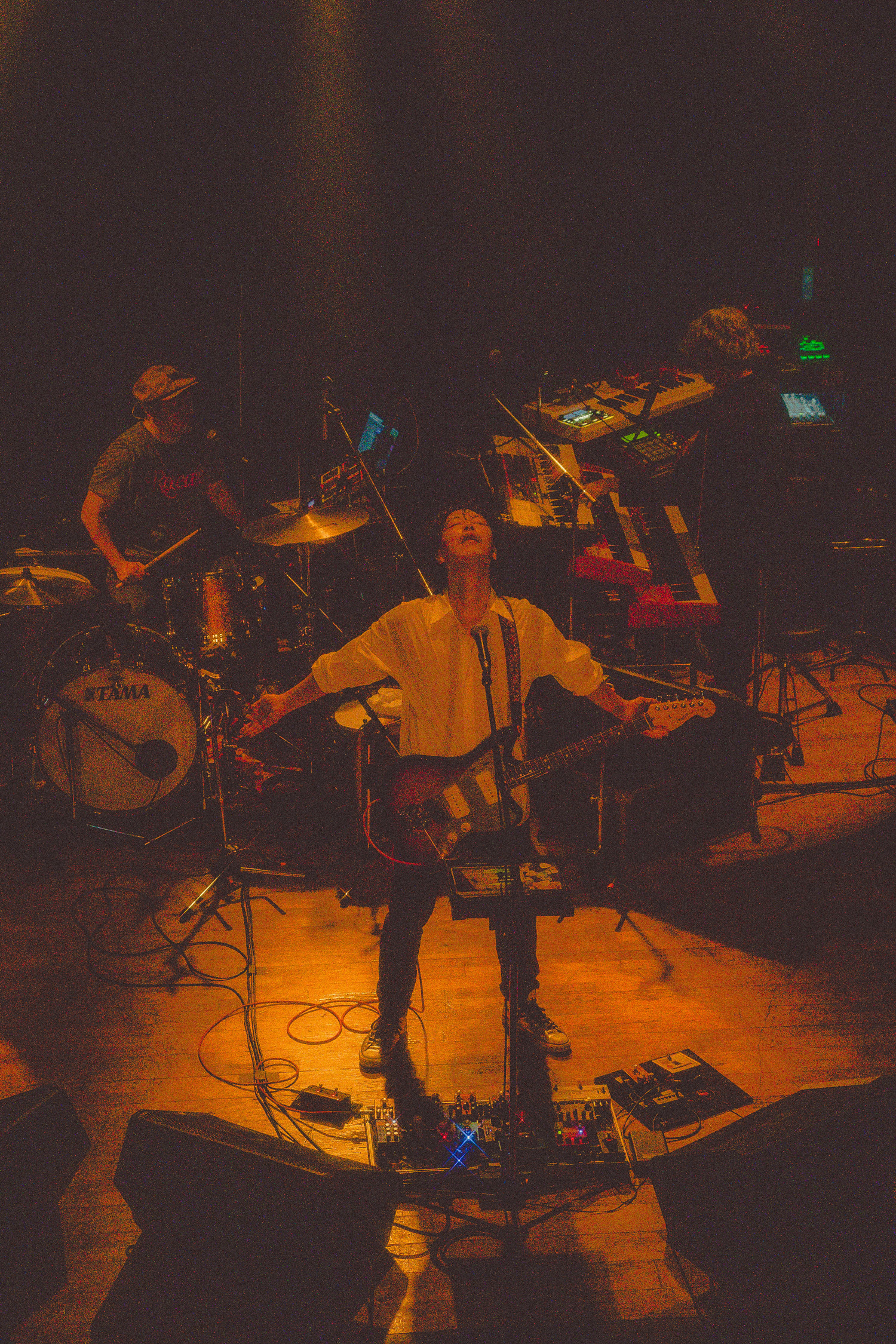 中盤に入り、「吹曝しのシェヴィ」からは力強く拓けた感じ、メロウながらもダンサンブル感を増していく「SHAME」、ラストにかけて低音が鳴り響き、田中のドスが効いた声が迫ってくる「MAWATA」と、音源とはまた違うライブならではのダイナミズムは堪らない……。だからこそ、一転して「UNOMI」のような真っ直ぐな田中の歌が耳に飛び込んでくる楽曲がより際立つ。ここから終盤は、どのように展開してくのだろうと期待に胸を膨らます中、ライブがスペースシャワーTVで11月27日(水)に放送されることも告げられる。そして、その情報以外は現段階で今年アナウンスされることがないとも告げられる。「良いお年を!」「スペシャで逢いましょう!」「スペシャを観てロスを埋めといて下さい!」などと冗談交じりに田中は喋るが、10月中旬という日付感覚としては年内もう観れないかもというのは残念でしかないものの、こんな特別な祝祭を年内最後に観れたことは幸運でしかない、というのも紛れもない事実。