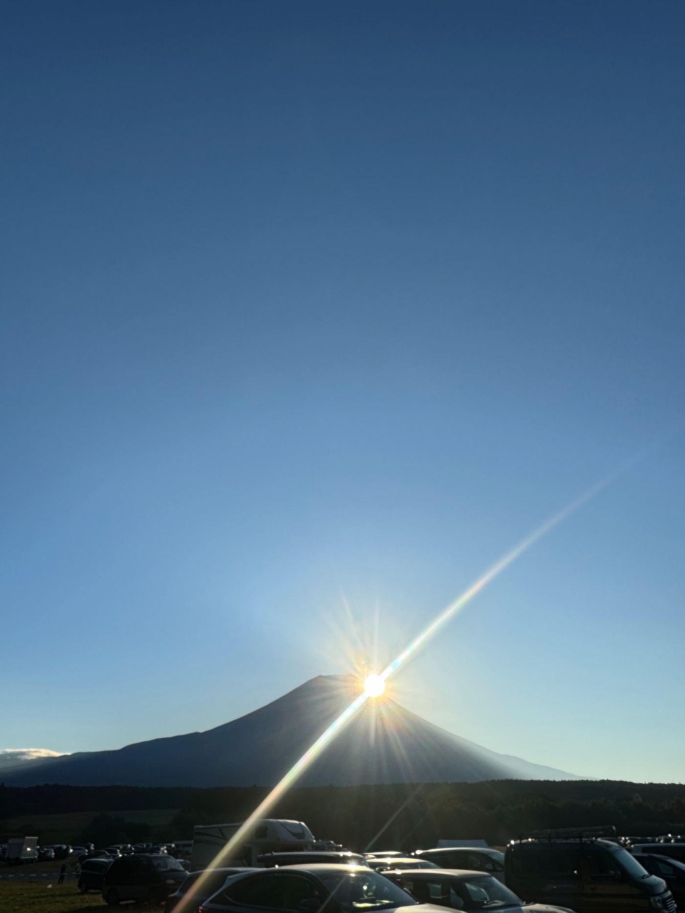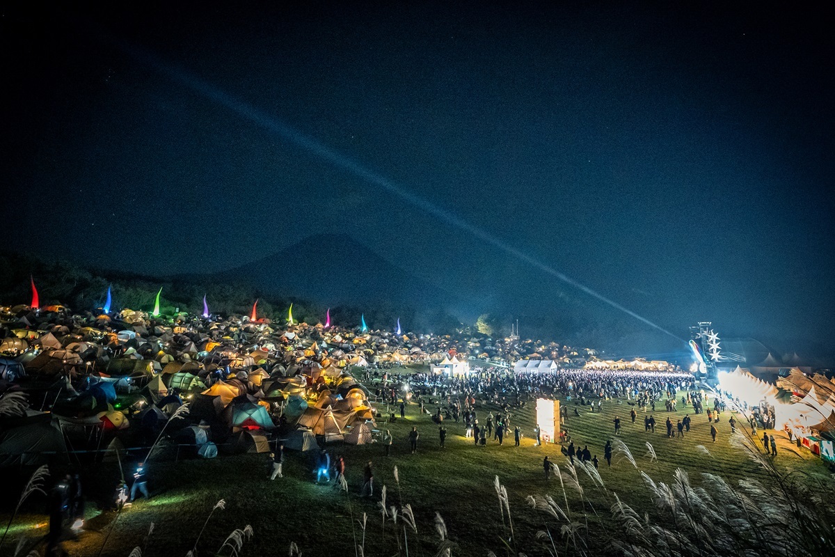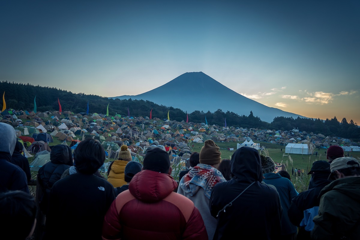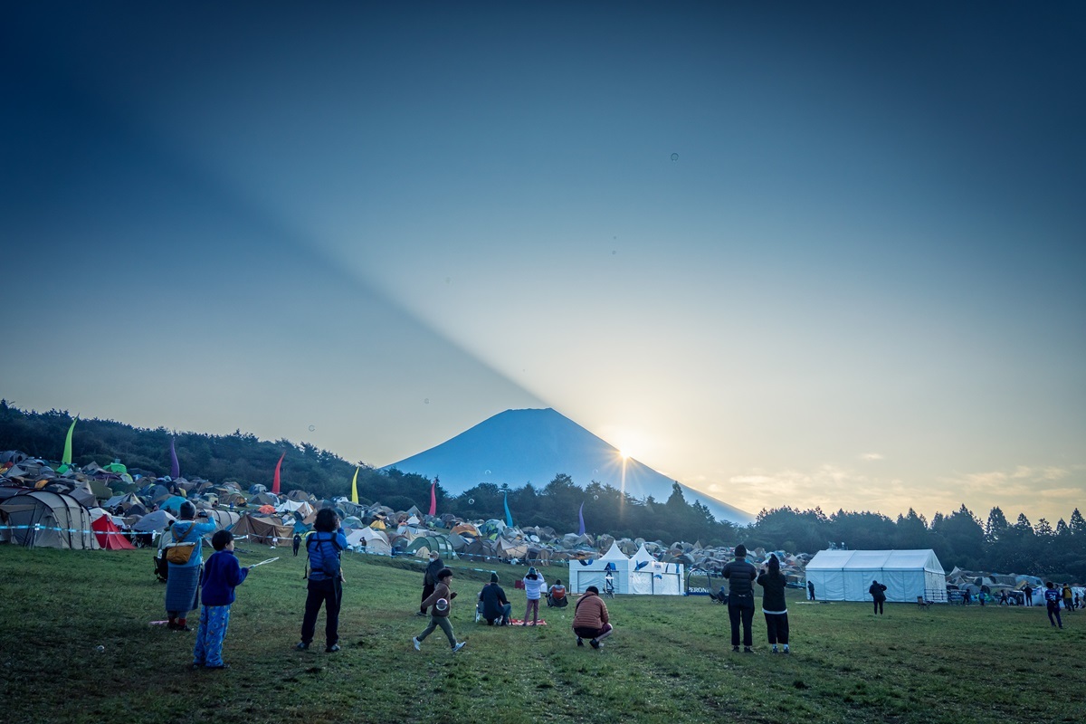 個性豊かなアーティストによるジャンルレスなショーと等しく、その美しい姿で『朝霧JAM』来場者を一日中楽しませてくれる日本の名峰・富士山。初日は顔を出してくれたものの、2日目は早朝以外は雲隠れ。夜になると黒富士となって姿を現し、この世のすべてを見守るようにどーんと鎮座。朝がくると再び雄々しい全貌が露わになり、人々を魅了していました。また、この時期はダイヤモンド富士を見られることで知られていますが、期間中は毎朝、山頂付近からの御来光を見ることができ、多くの来場者が早起きをしてその幻想的な光景に見入っていました。