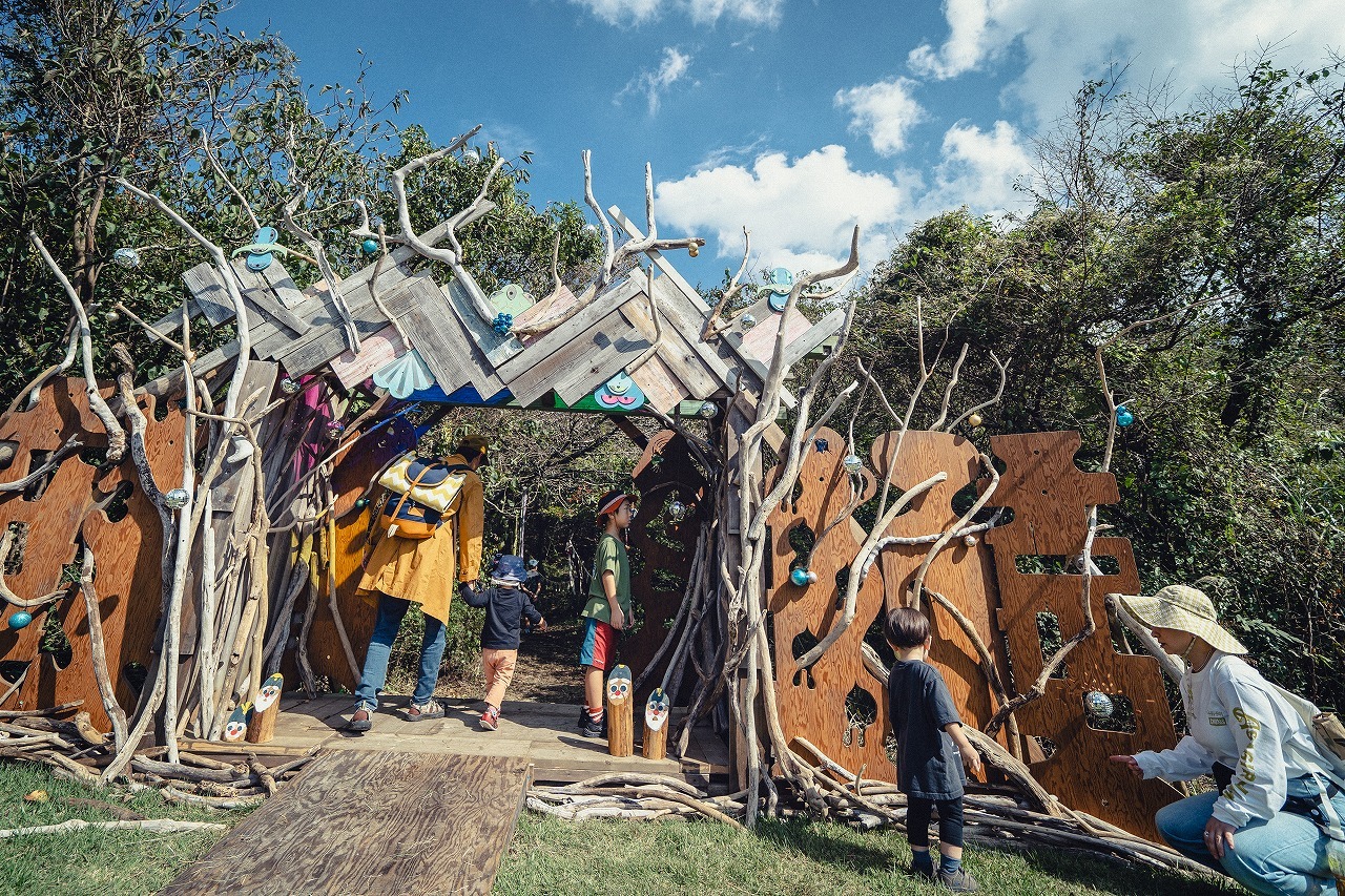 『朝霧JAM』を支えるボランティア・スタッフの笑顔と挨拶には、終始癒されました。また来場犬も多く、秋田犬、グレートデン、柴犬、チワワ、ボーダーコリーなどの様々な犬種を愛でることができ、犬好きとしては眼福。また、キッズランドでは森のトンネル、焚き火、長縄、丸太や竹を使ったあそびに夢中になる子どもたちとそのファミリーが思い思いに過ごし、ゆったりとした時が流れていました。
