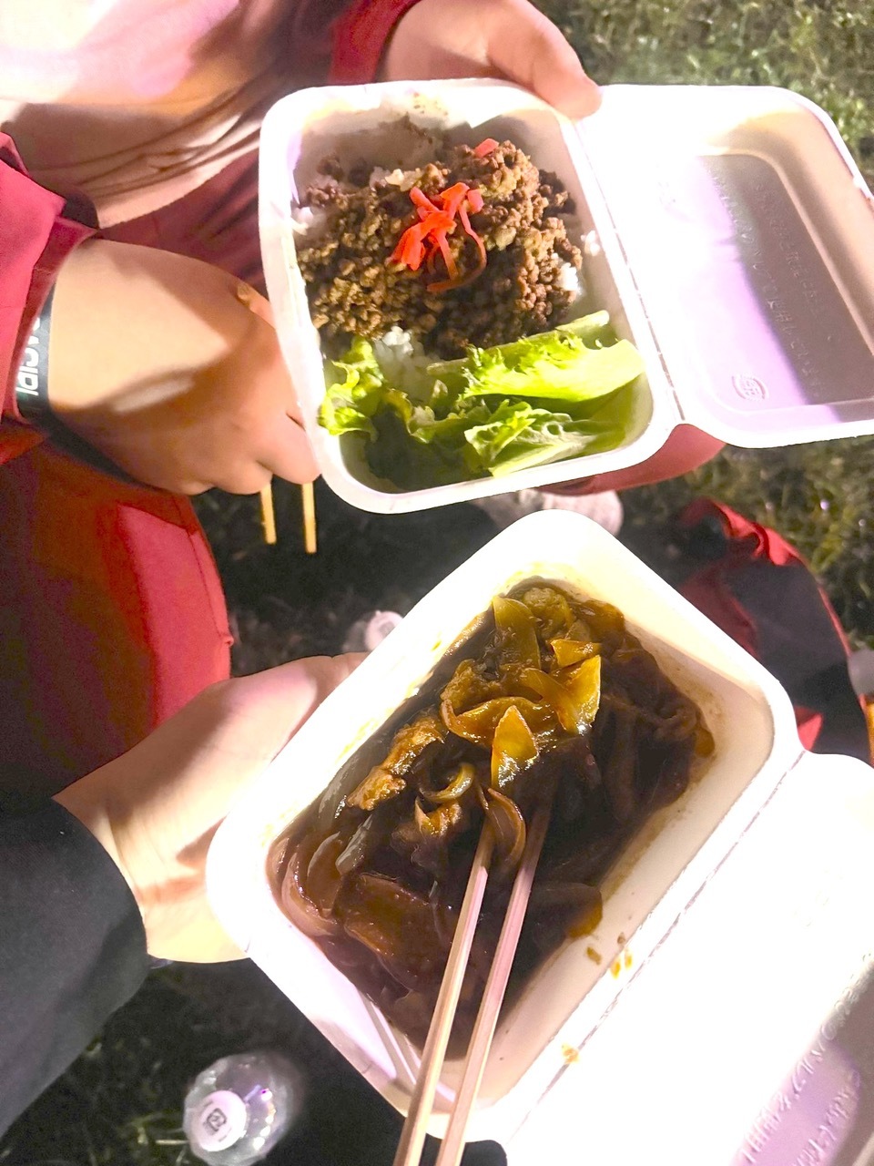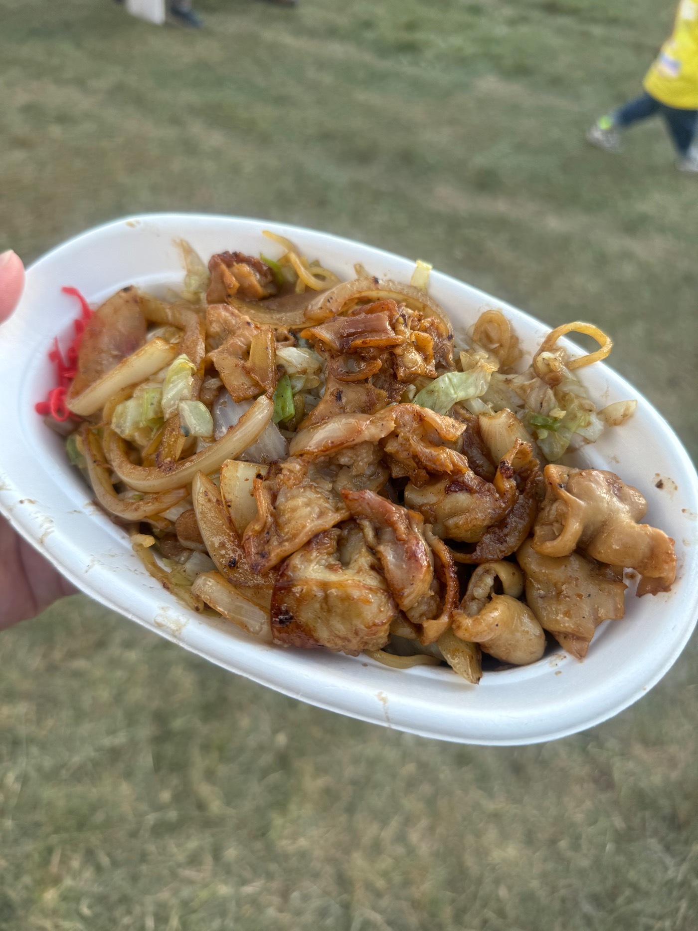 人気No.1の一押しメニュー、ホルモン焼きそばの盛り付けの豪快さに圧倒されつつ、いざ食べると箸は止まることなく一気に食べてしまえるおいしさ。地元の人気店の逸品をフェスで、しかも野外で食べられることに大きな幸せを感じずにはいられませんでした。