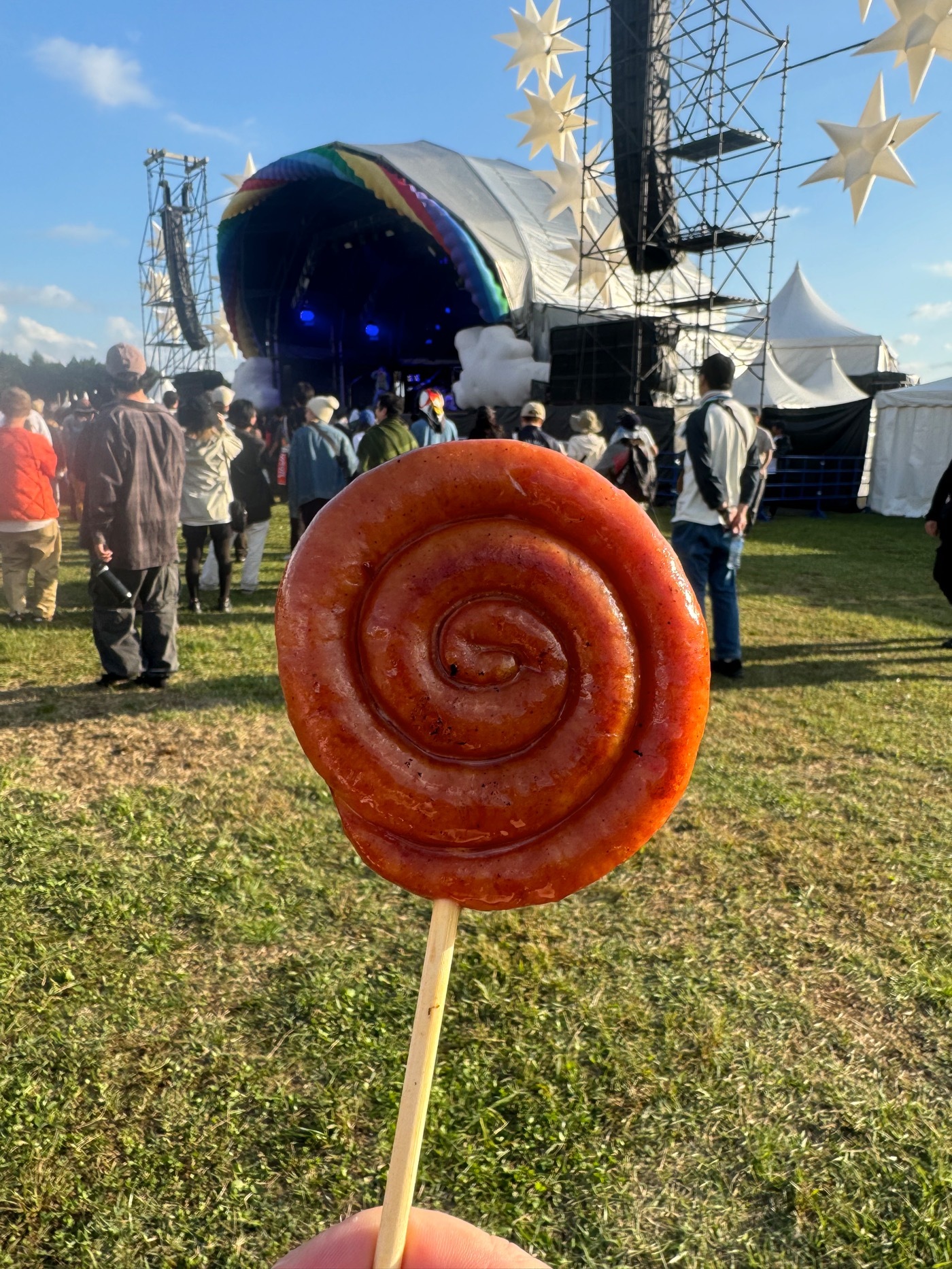 『朝霧JAM』といえば朝霧JAM食堂の定番・グルグルウインナー! 『フジロック』でもおなじみですが、これだけは食べずにはいられないということで、到着早々、かけつけ1本を食べました。また、日曜朝に限定販売される人気の富士宮焼きそばパンは買えなかったので来年トライします。