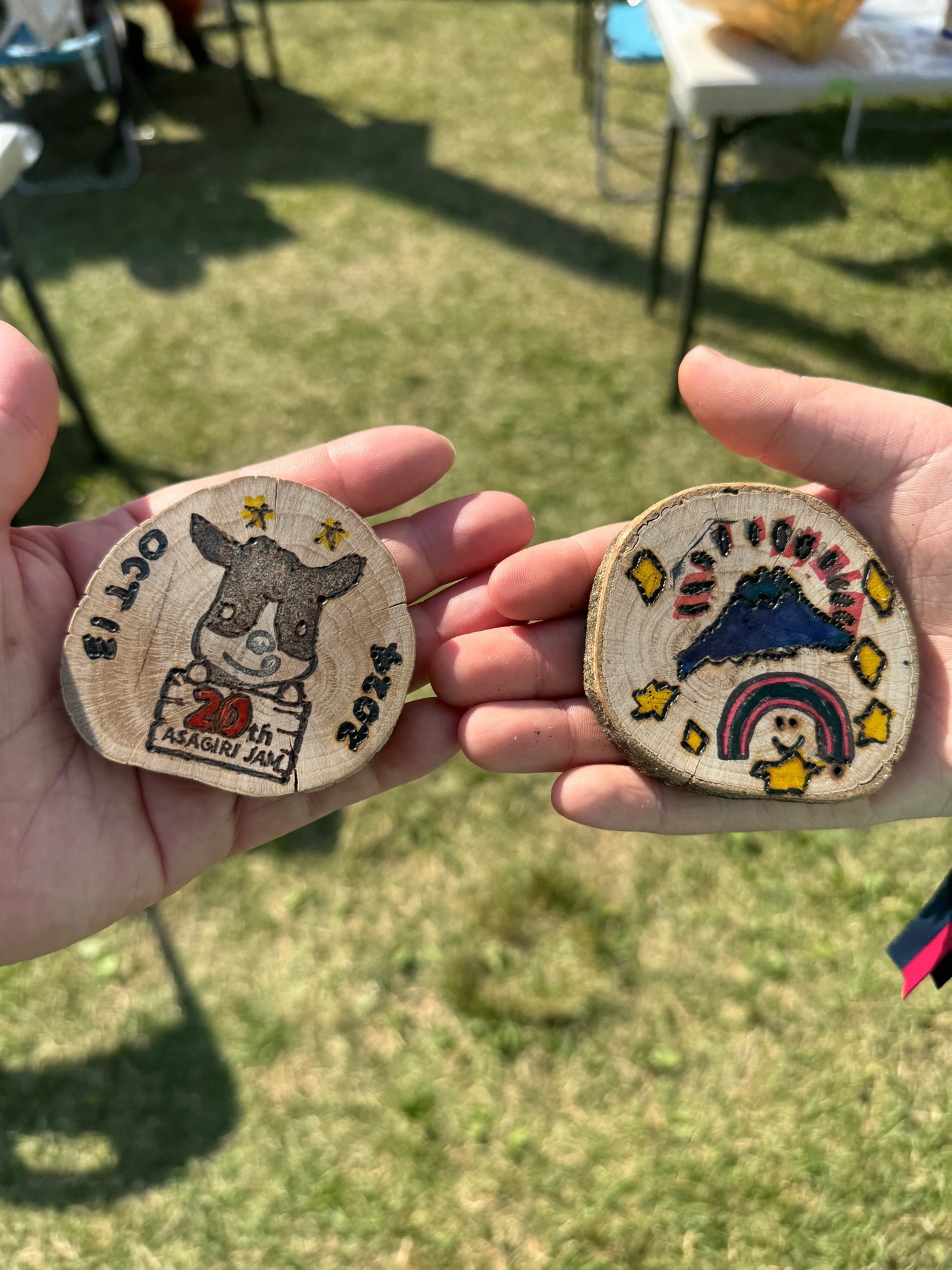 キッズランドで展開されていたワークショップの中のひとつが、このウッドバーニング。間伐材でできたコースターを購入し、スタンプ、ペンなどを使って下書きしたものをウッドバーニング専用の道具で木を焼き付けていくというもので、スタッフさんに教えてもらいながら世界にひとつだけのコースター創作に没頭。なお、使われていた間伐材は、ふもとっぱら産! ふもとっぱらでキャンプをしながらの参加だったので、よりよい思い出の品となりました。