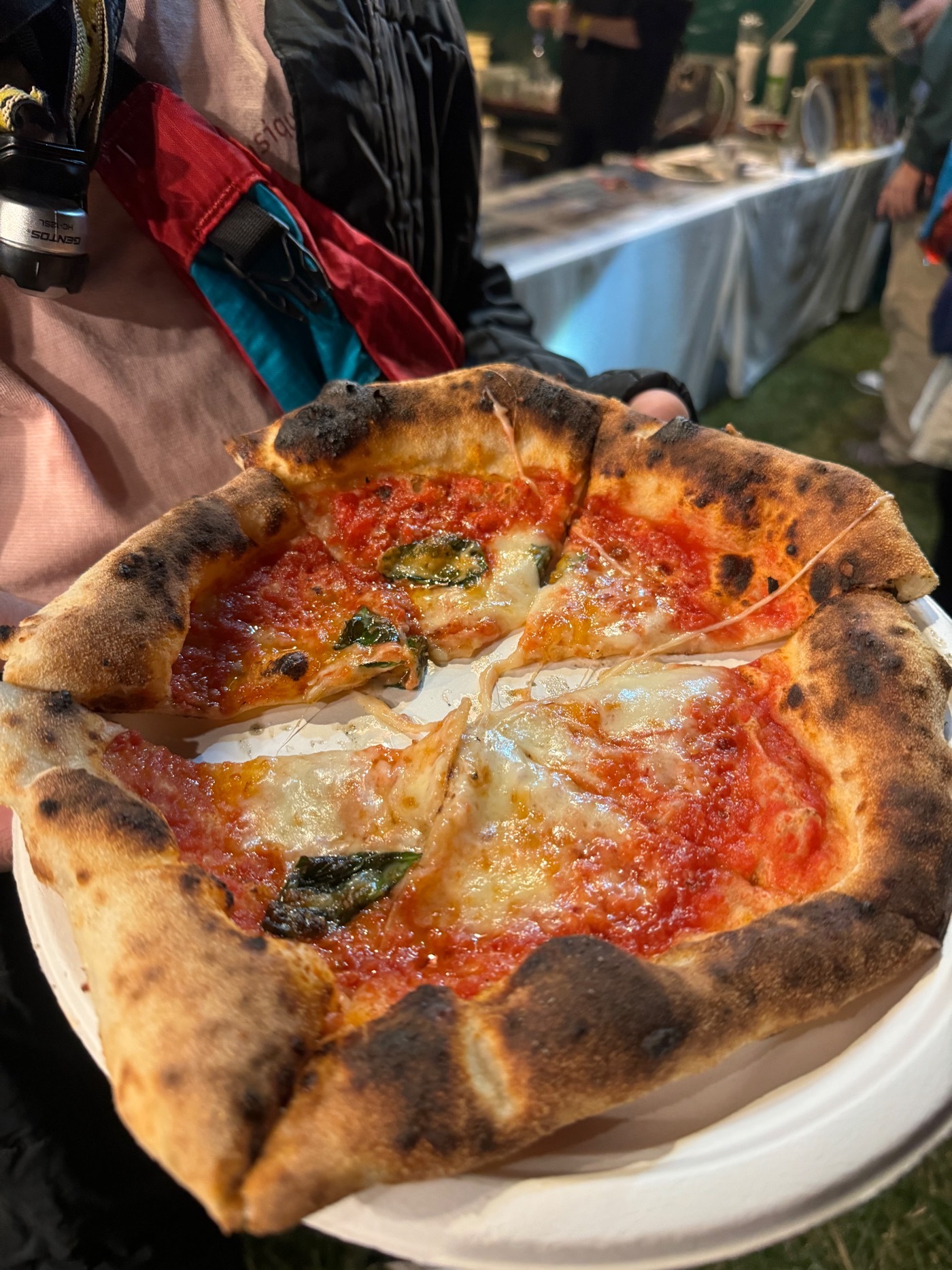 通り過ぎる人がみな手にしていたのが『朝霧JAM』に初登場したピザ。沼津市で営業するナポリピッツァ専門店による、こだわりの生地とイタリアや地元の食材で作られたピザは、高温の窯で一気に焼き上げられ、待ち時間もほとんどなくてストレスフリー。標高900メートルでいただく焼きたてのマルゲリータは最高で、ペロっと平らげてしまいました。