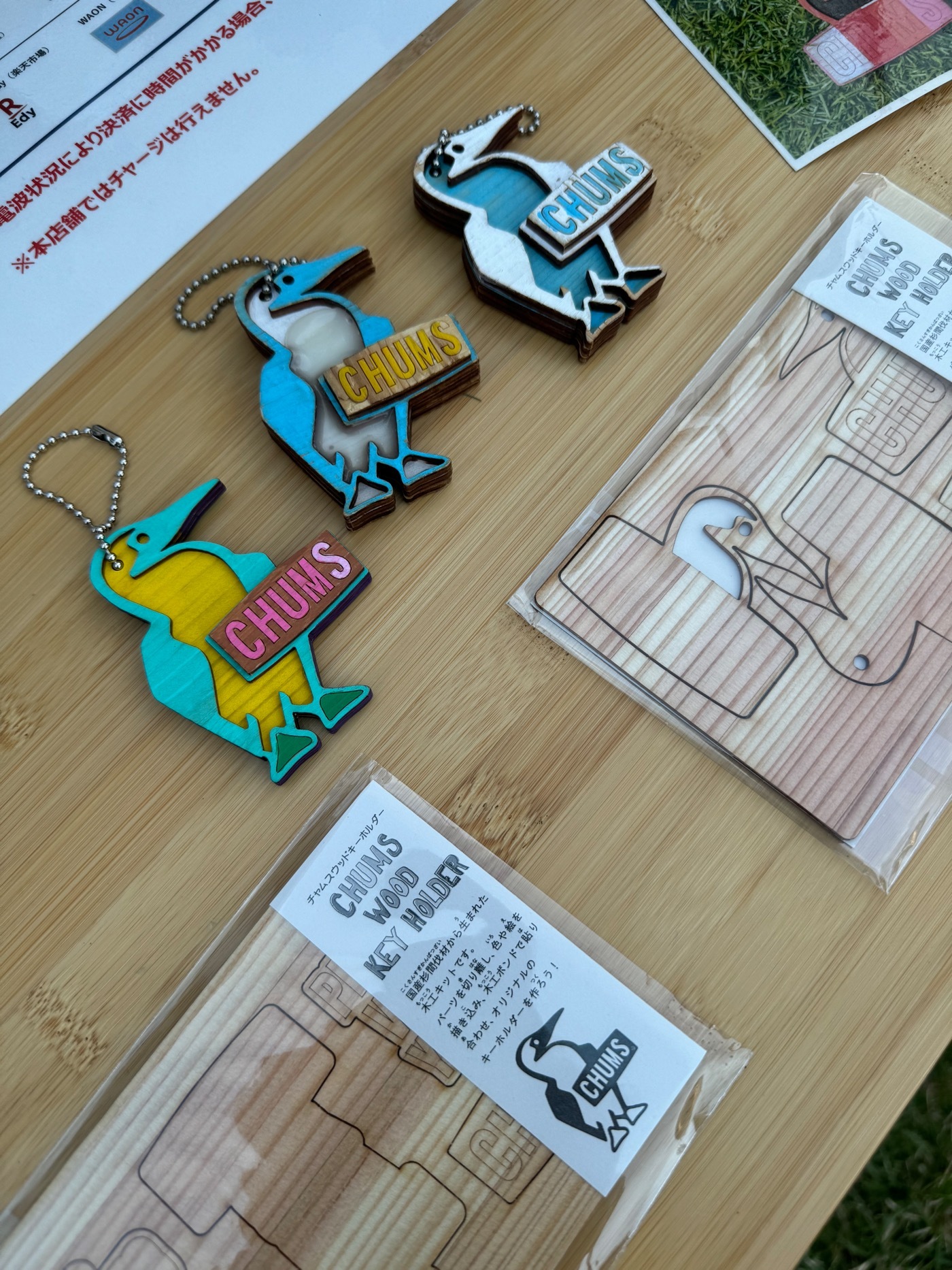 スタンプラリーの途中、キャンプサイトIにあったCHUMSのワークショップに参加。木工キットを購入し、型抜きをして自由にカラーリングしたらボンドで止めて、ボールチェーンを通して出来上がり。スタッフさんと楽しくおしゃべりをしながら、20分ほどでかわいい思い出がひとつ出来上がりました。