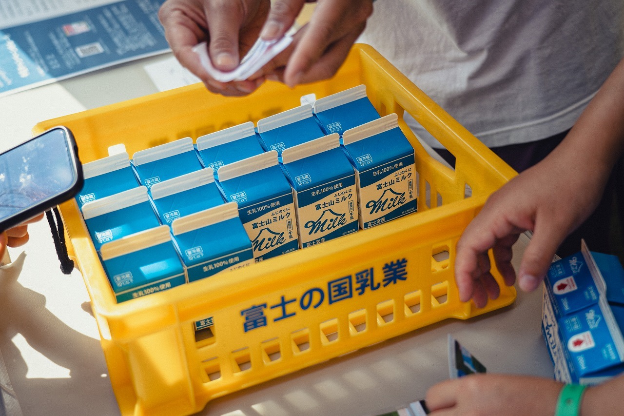 地元・富士宮市の魅力を伝える様々なブースも連日大賑わいで、母親たちによるNPO法人 母力向上委員会や富士宮市役所の人々が中心となって、地元アピールに活気づいていました。また、開催地の富士宮市朝霧高原といえば有数の酪農エリアであり、おいしい牛乳の産地。原料高などでピンチの今、朝霧の酪農を応援する「牛乳キャンペーン」が行われ、朝霧高原・ふじのくに富士山ミルクが無料配布されました。