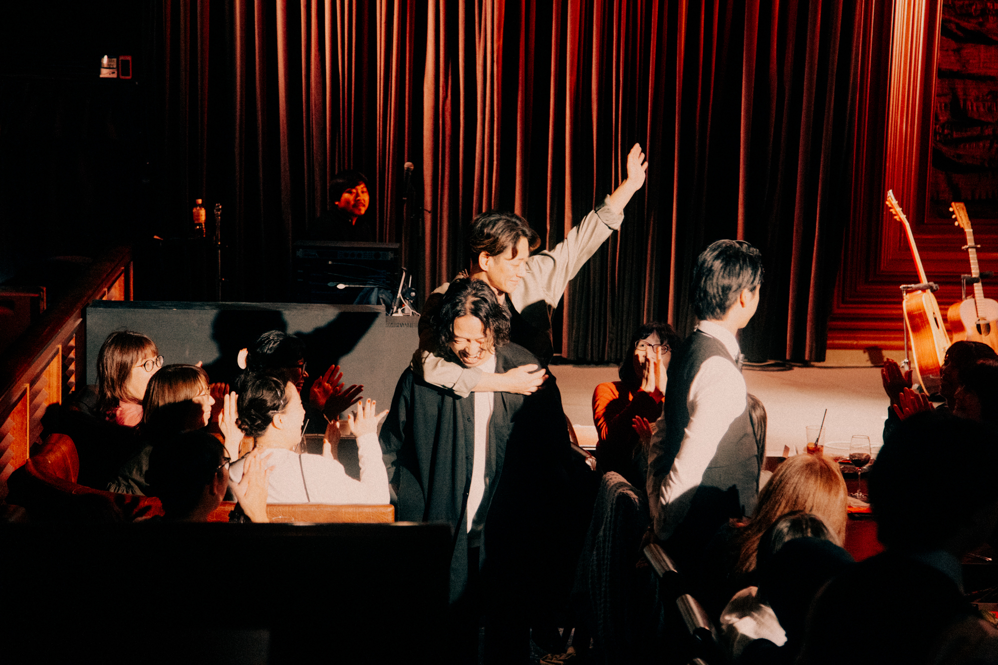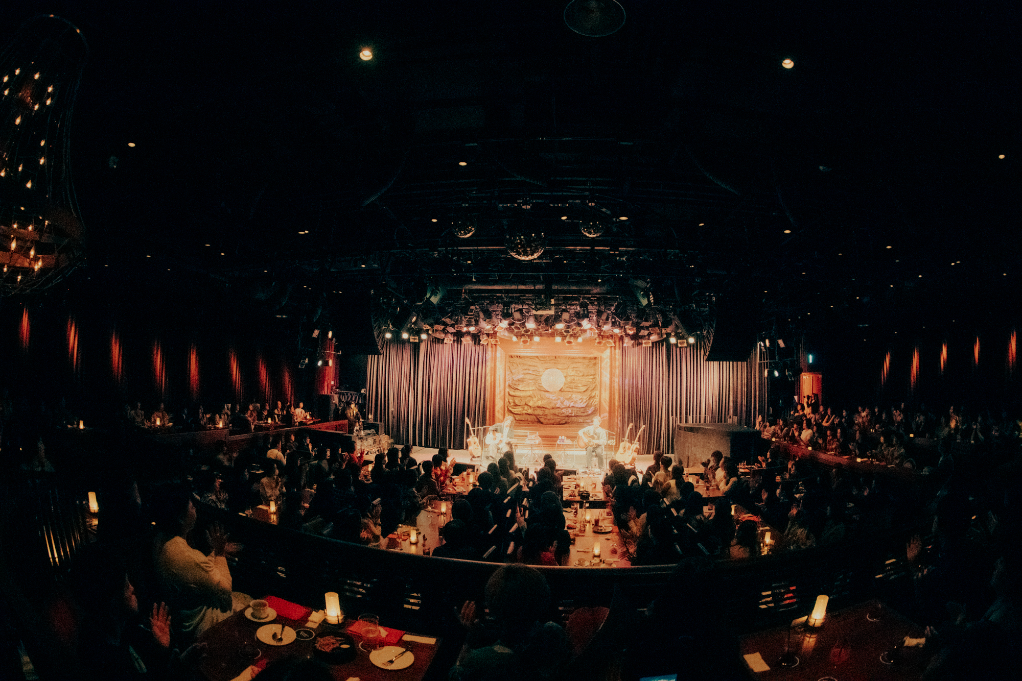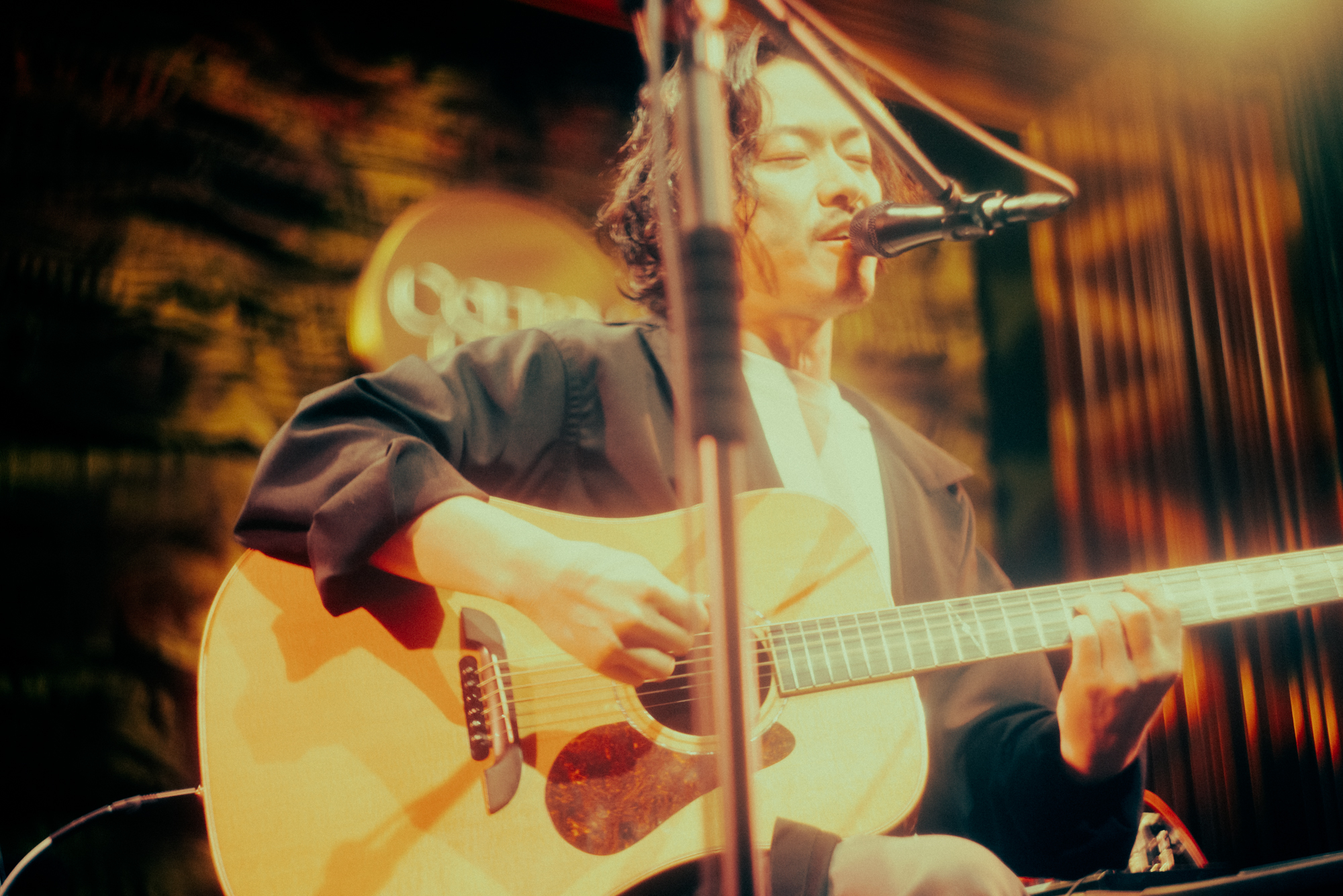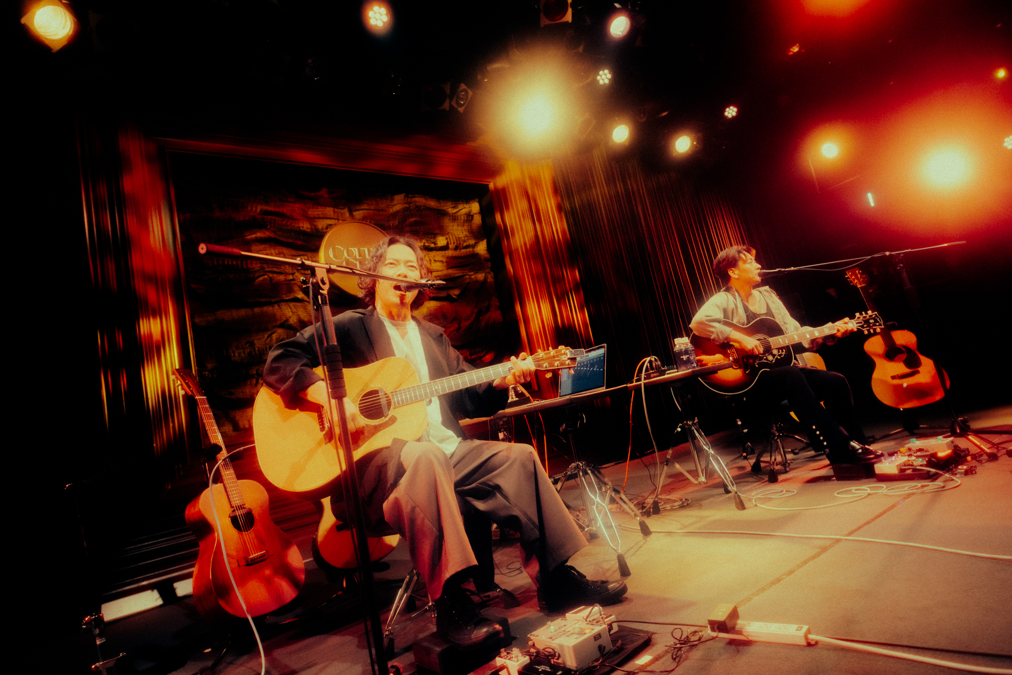 会場は丸の内にあるライブレストラン・COTTON CLUB。70分ほどのセットを2ステージ行うスタイルであり、僕が観たのはその2本目。村松拓の実家の味をベースにしたというチキンのトマト煮や、山田将司が考案したオリジナルカクテルをはじめとしたドリンクとフードを観客たちが楽しむ中、暗転したかと思ったらすぐさま現れたふたり。「ようこそ、とまとくらぶ『大収穫祭2024』へ」(山田)、「イエイ!楽しんでいきましょう」(村松)。会場の雰囲気もあってか普段ほどくだけたテンションではないが、朗らかな様子を見る限り気負いはなさそうだ。