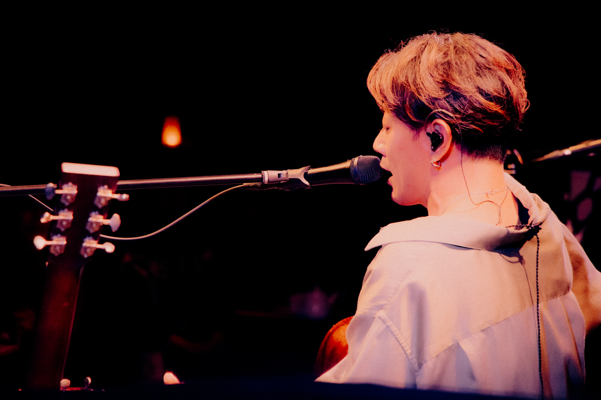 2ステージとも完売したという満員の場内を見渡しながら「どういうことなんだろうね?」ととぼけてみたり、「「とまとめいと」でちょっと俺泣きそうになっちゃった」などと率直に感慨を明かしたりしつつ、ライブは進んでいく。淡々と刻む8ビートが次第に力強さを増しながらメロディアスでポップス然としたサビへと至る「Sunny Side Song」から、往年のレディオヘッドばりの儚げなアルペジオが静謐な空気を生む「交差点」へ。酸いも甘いも噛み分けてきたボーカリストだから表現できることもいろいろある、というMCでの言葉通り、歌う内容だけでなくサウンドの方向性も実に多彩。普段のバンドで表出している/いないに限らず、ふたりの通ってきた音楽遍歴までどことなく垣間見えるのがいい。